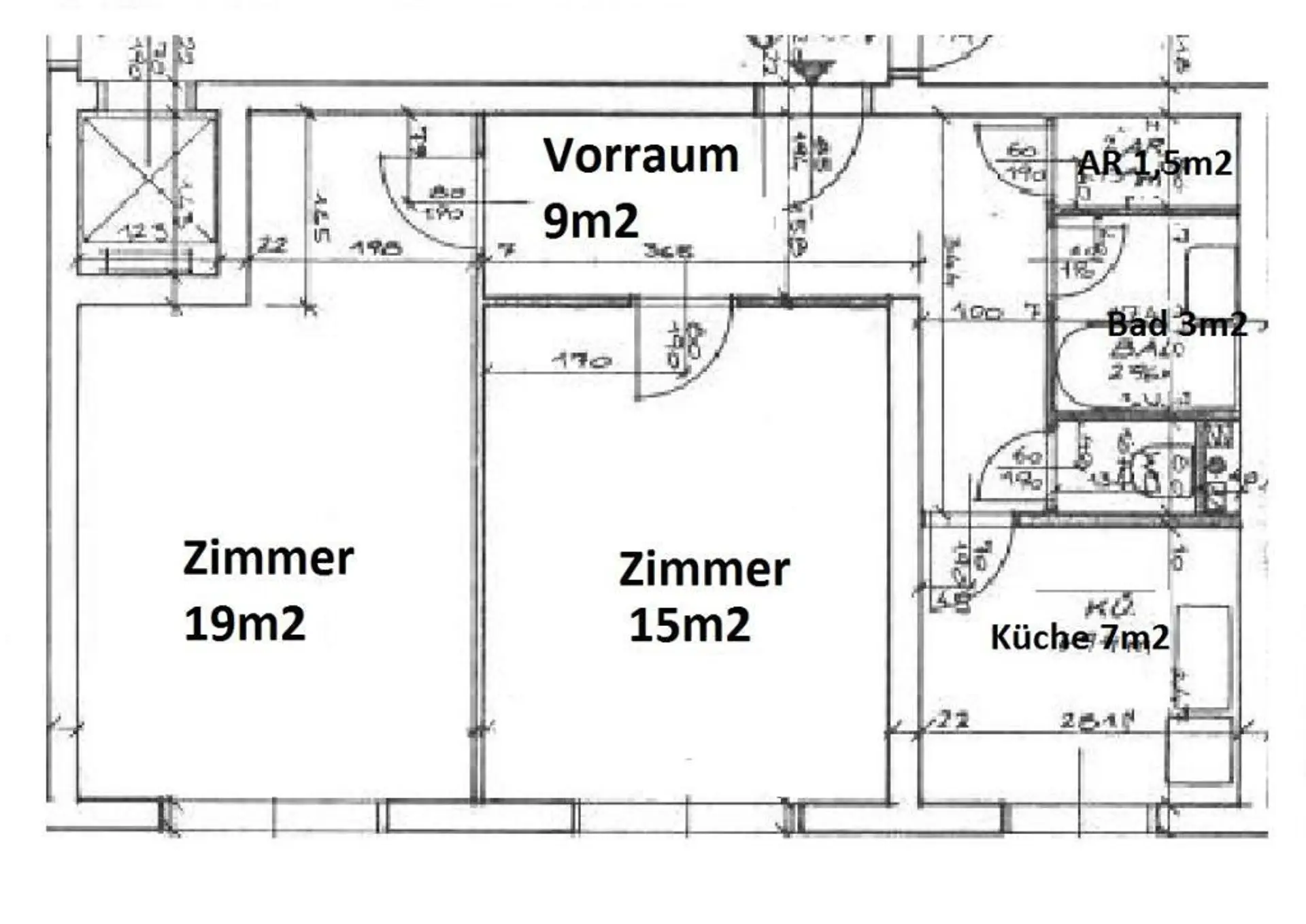 Raumaufteilung: Vorraum, Abstellraum, Bad, WC, Küche und 2 weitere Zimmer.