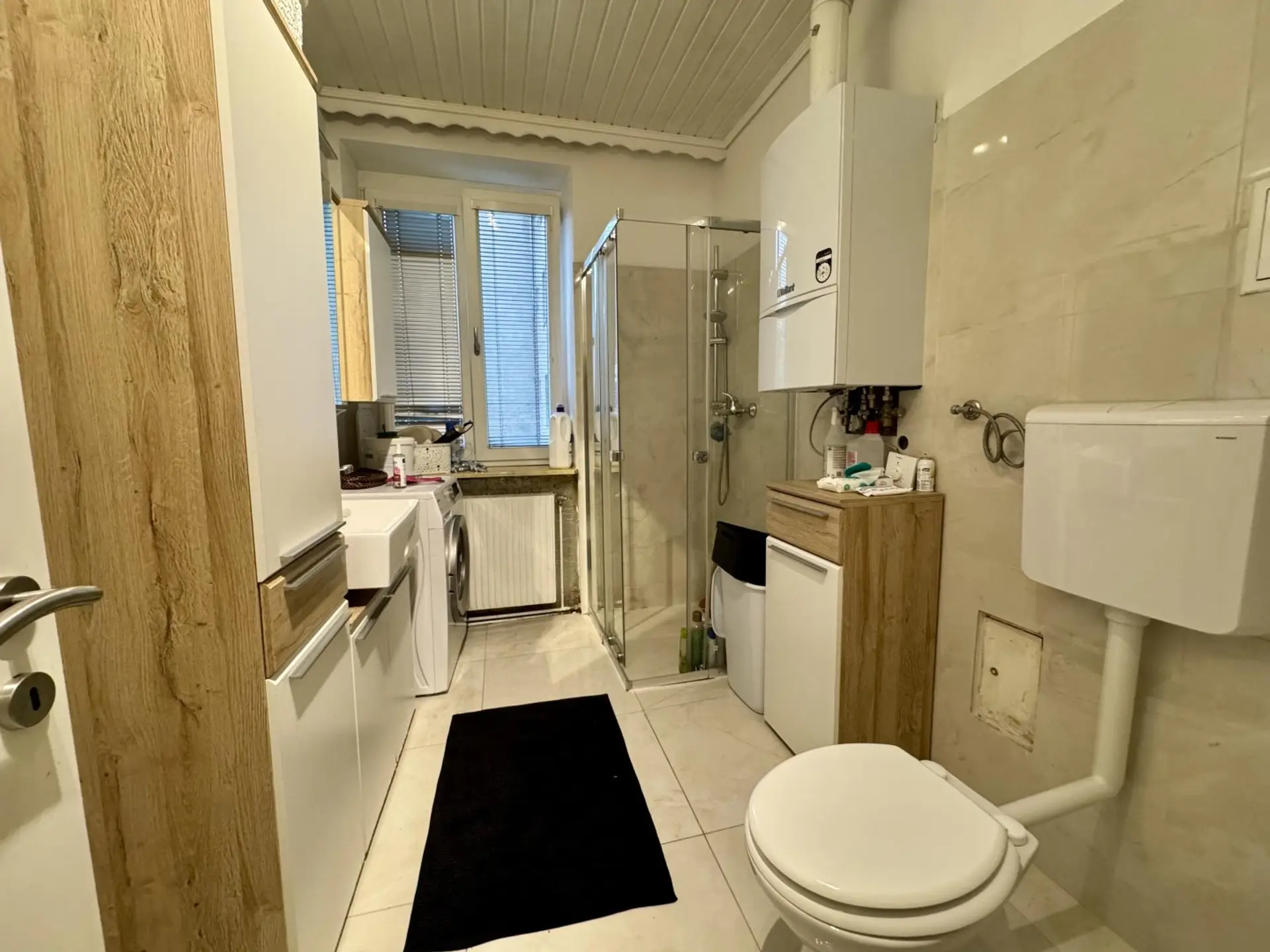 Das Badezimmer verfügt über eine Dusche und beinhaltet auch das WC.