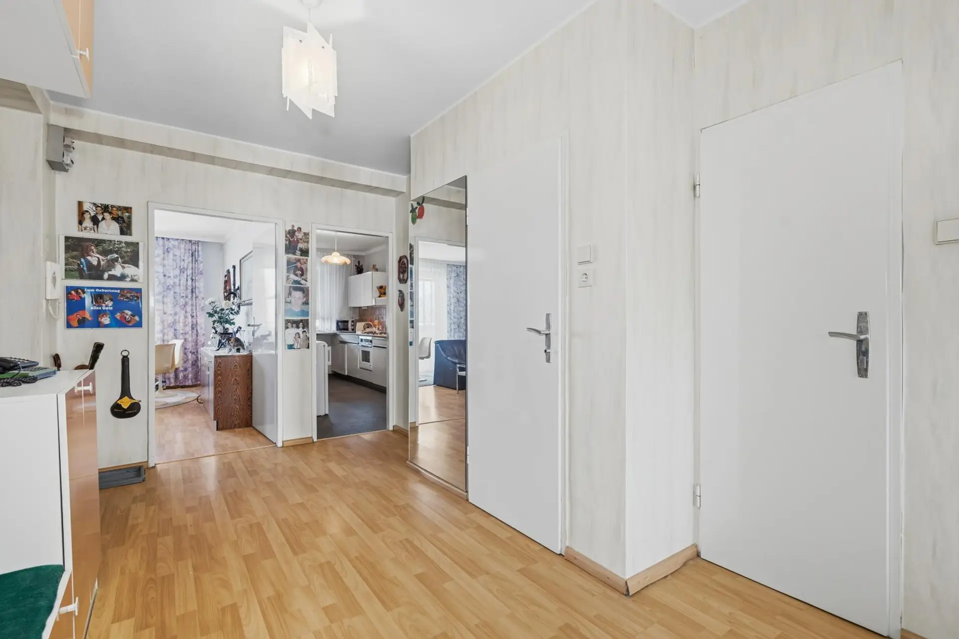 Die Wohnung verfügt über eine Wohnfläche von ca. 77,7 m² sowie eine zusätzliche Loggia mit rund 10,21 m², wodurch sich eine Gesamtfläche von etwa 87,91 m² ergibt. Bereits beim Betreten empfängt Sie ein großzügiges Vorzimmer, das ausreichend Platz für Garderobe und Stauraum bietet.