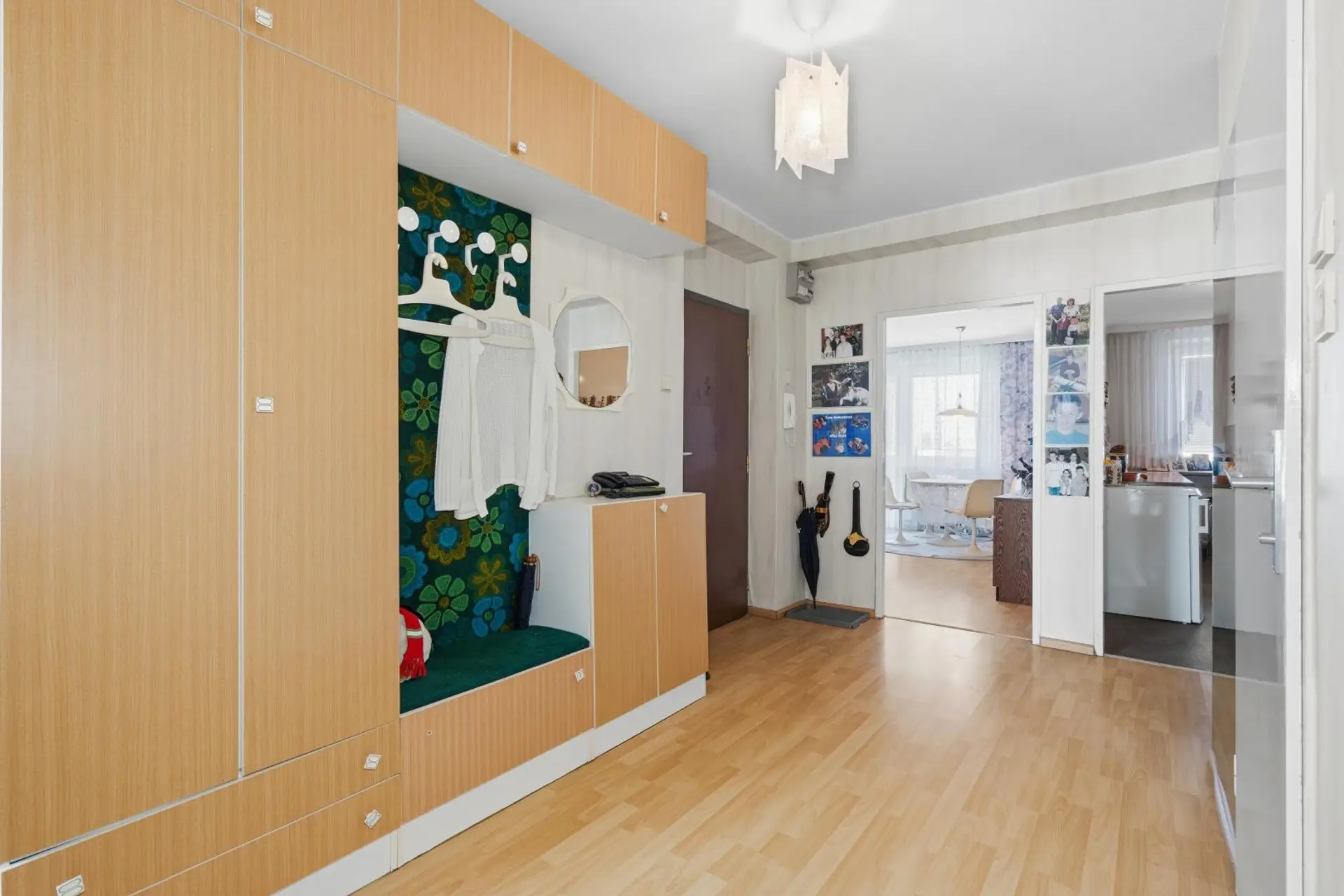 The apartment offers a living area of approximately 77.7 m², plus an additional loggia of around 10.21 m², resulting in a total area of about 87.91 m². Upon entering, you are welcomed by a large entrance hall with ample space for a wardrobe and storage.