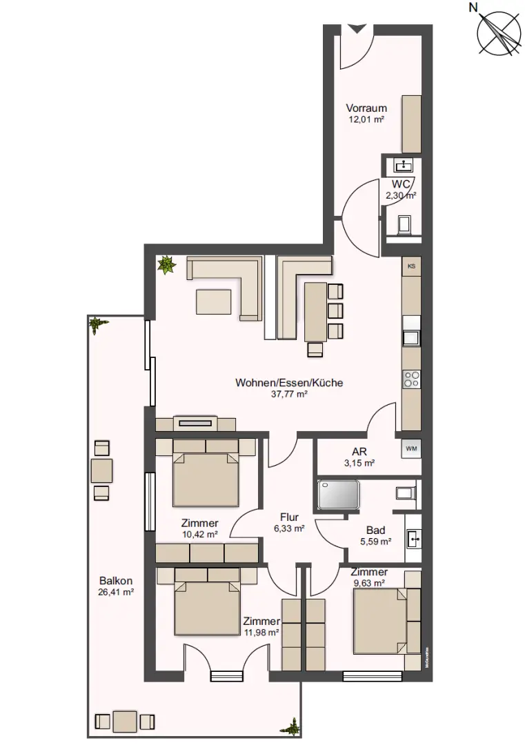 Ein besonderes Plus ist der großzügige Balkon mit ca. 26 m², der ausreichend Platz für Sitzmöbel und einen Essbereich im Freien bietet.