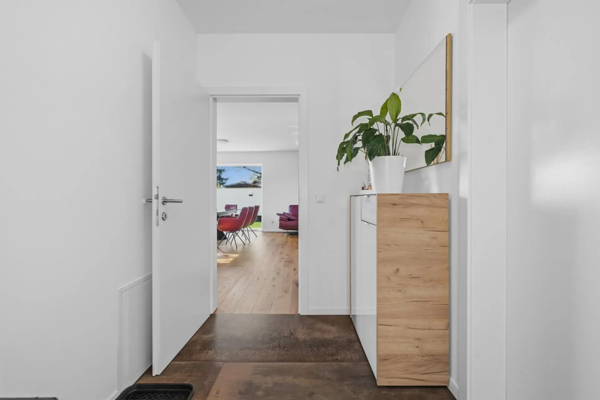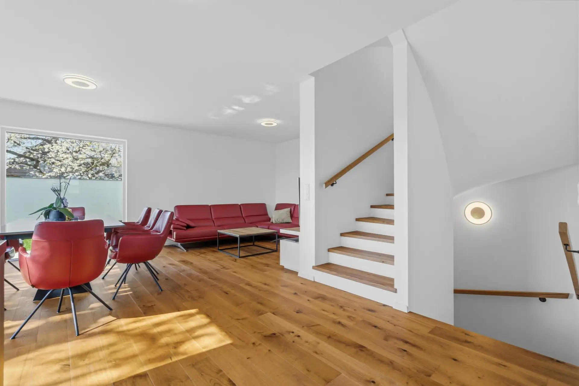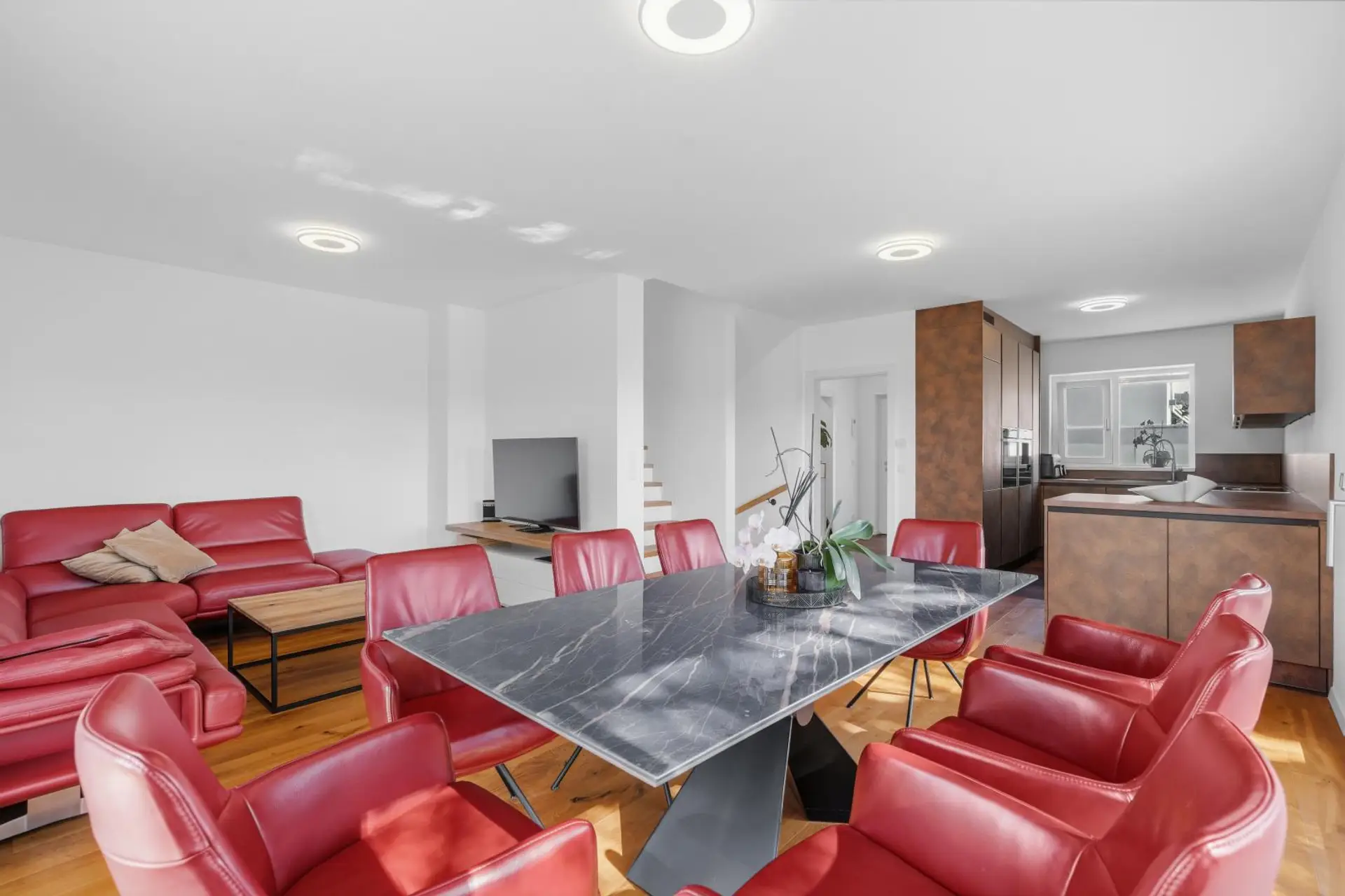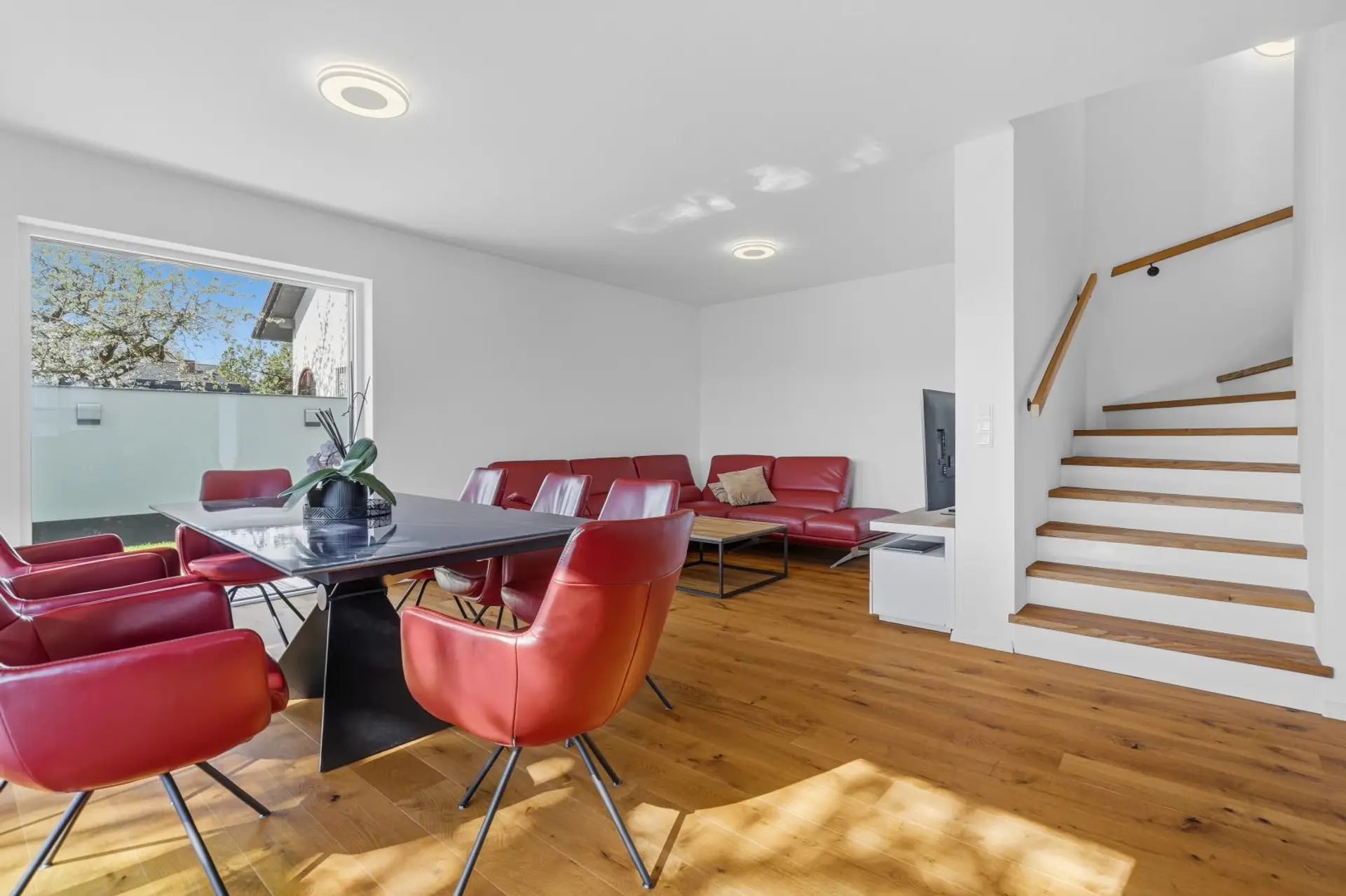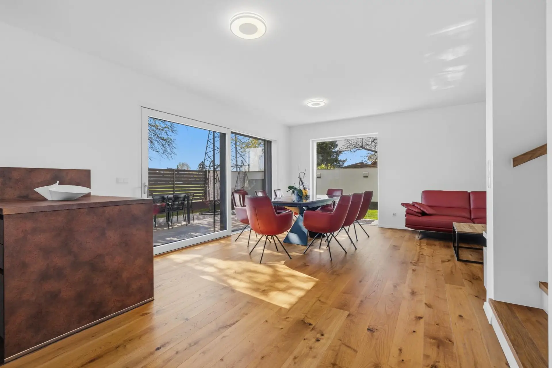 Das Herzstück des Hauses ist der großzügige Wohn-, Ess- und Küchenbereich im Erdgeschoss. Die moderne DAN-Küche ist mit allen Geräten ausgestattet, darunter Kühlschrank, Tiefkühlkombination und Elektroherd. Von hier aus gelangen Sie direkt auf die Terrasse und in den Garten.