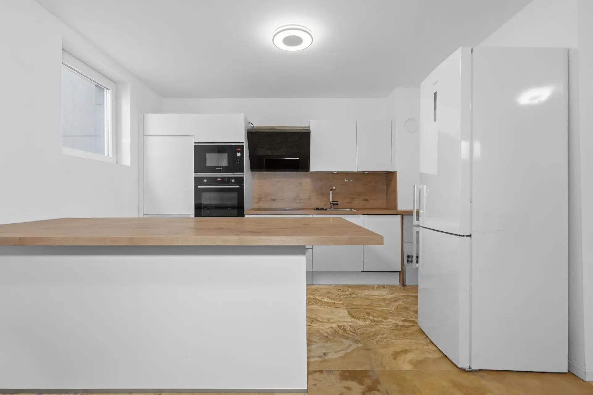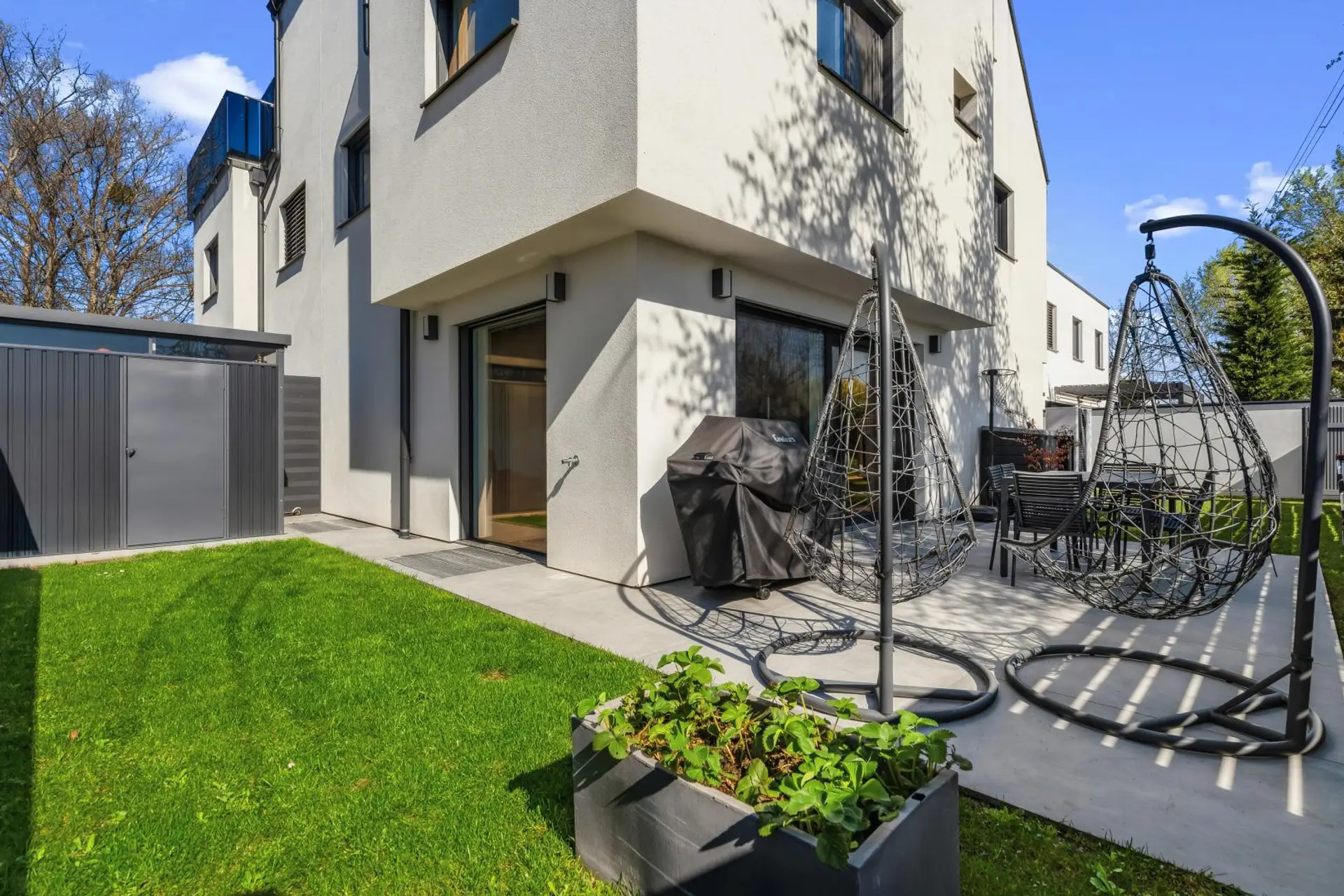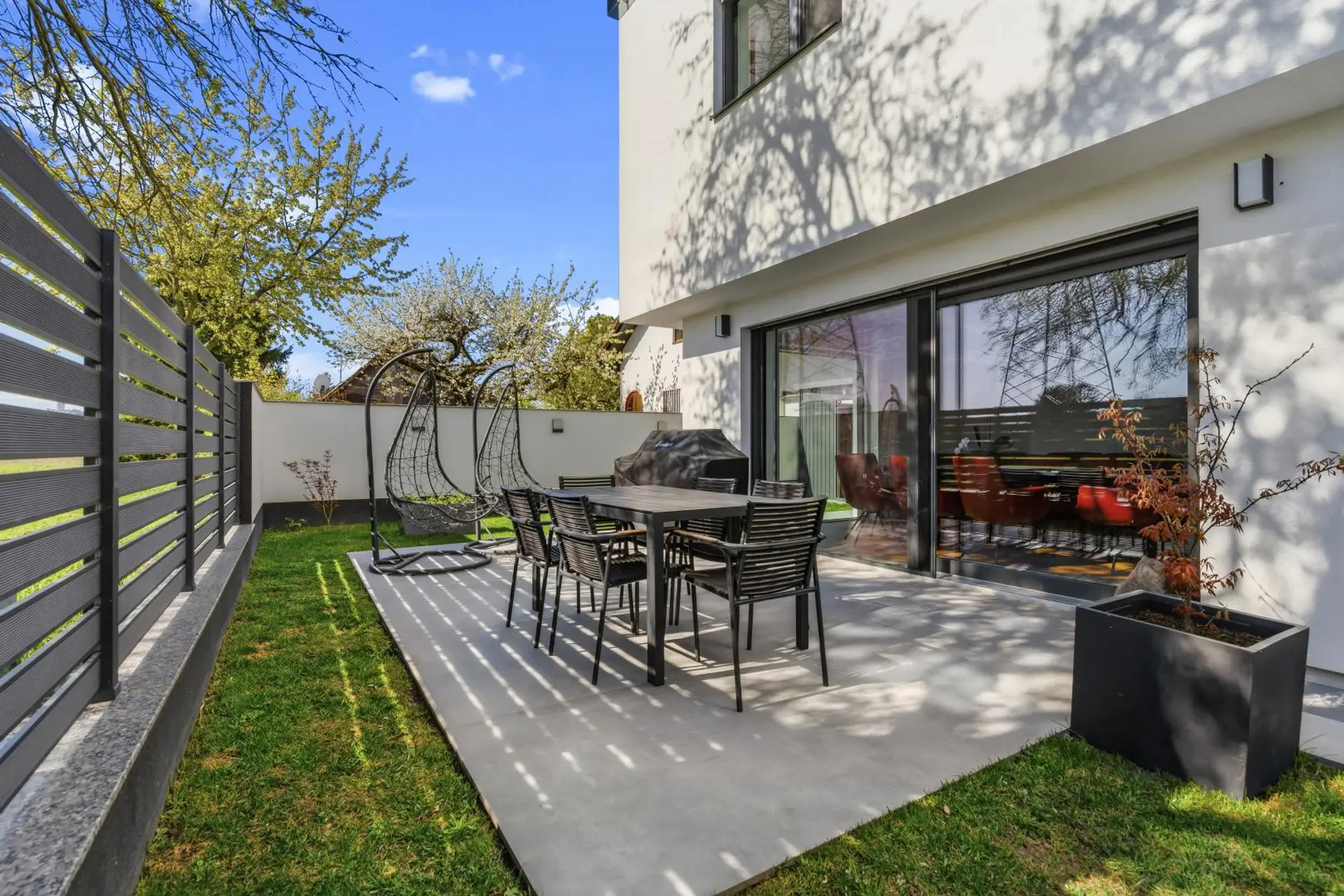 The heart of the house is the spacious living, dining, and kitchen area on the ground floor. The modern DAN kitchen is fully equipped with all appliances, including a refrigerator, freezer combination, and electric stove. From here, you have direct access to the terrace and garden.