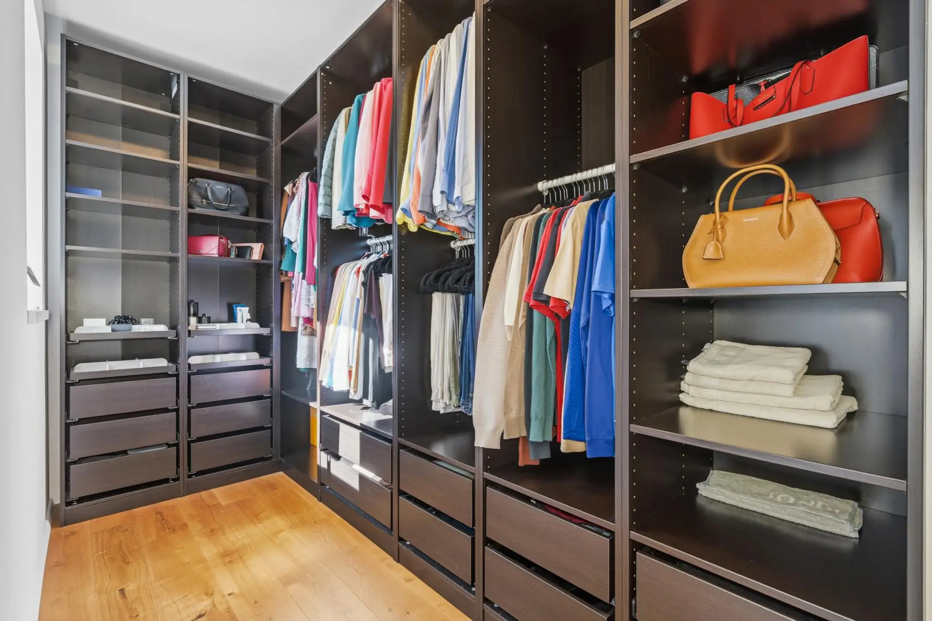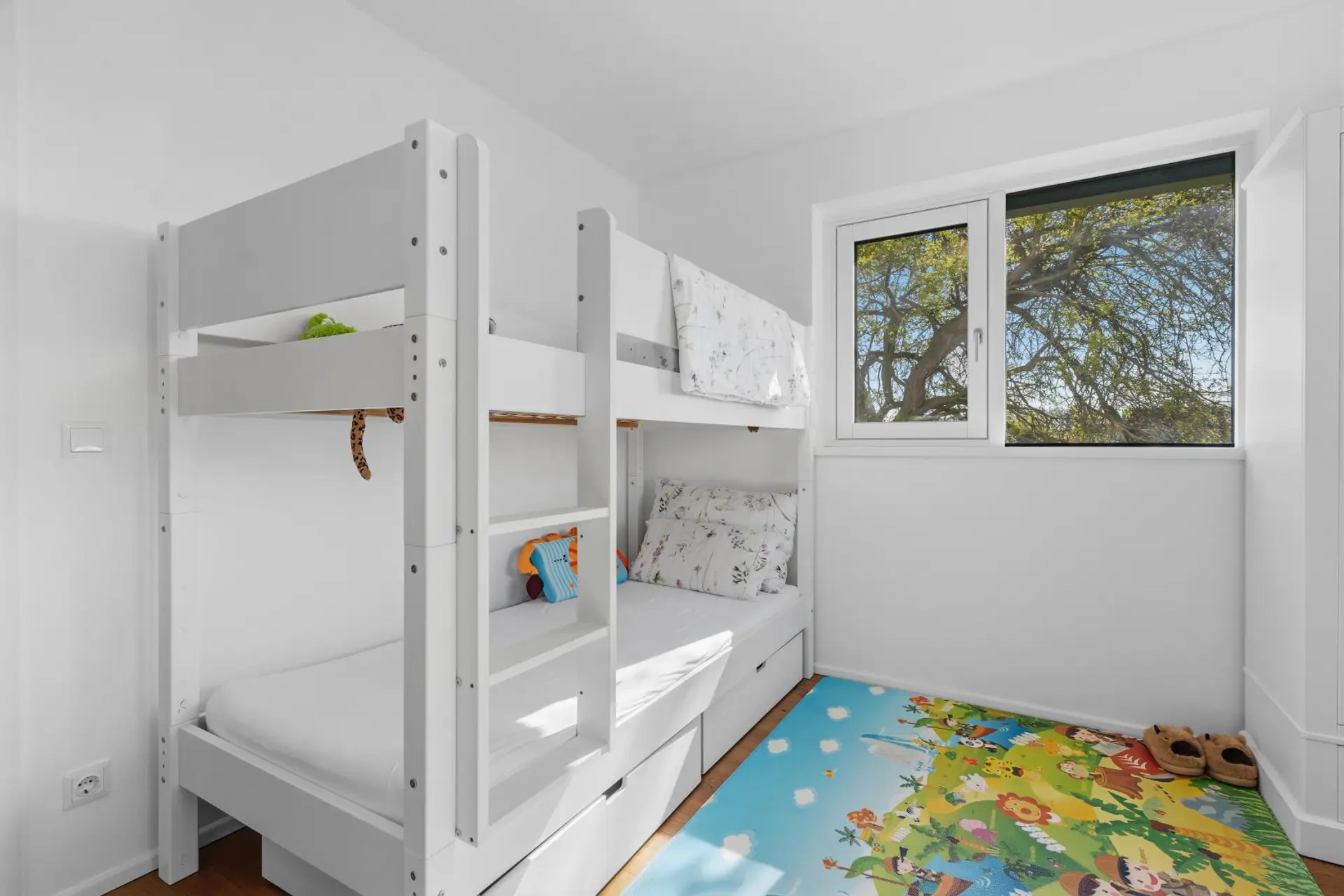 A solid wood staircase leads you to the upper floor, where you will find three bedrooms as well as an exclusively equipped bathroom with both a shower and a bathtub.