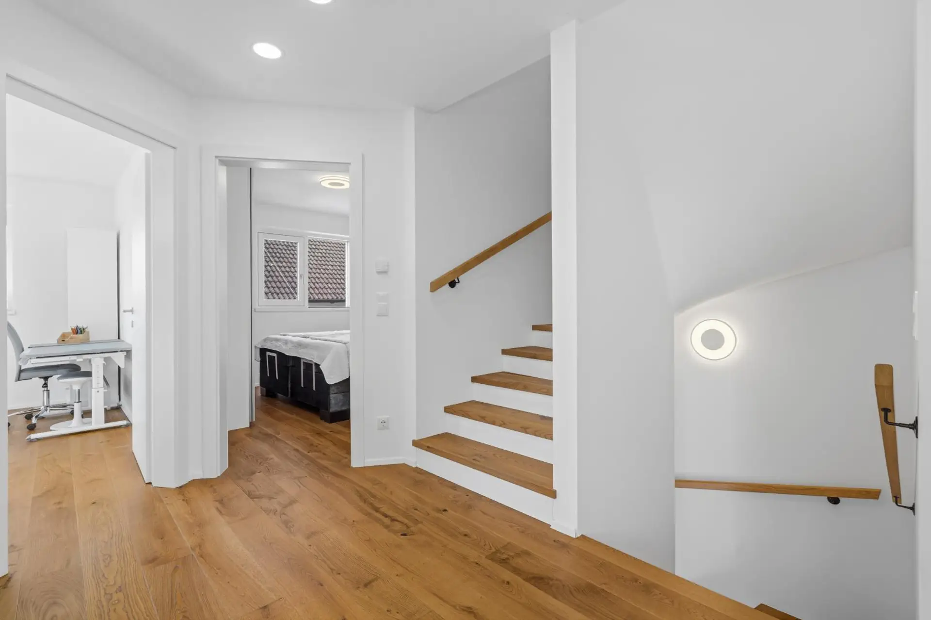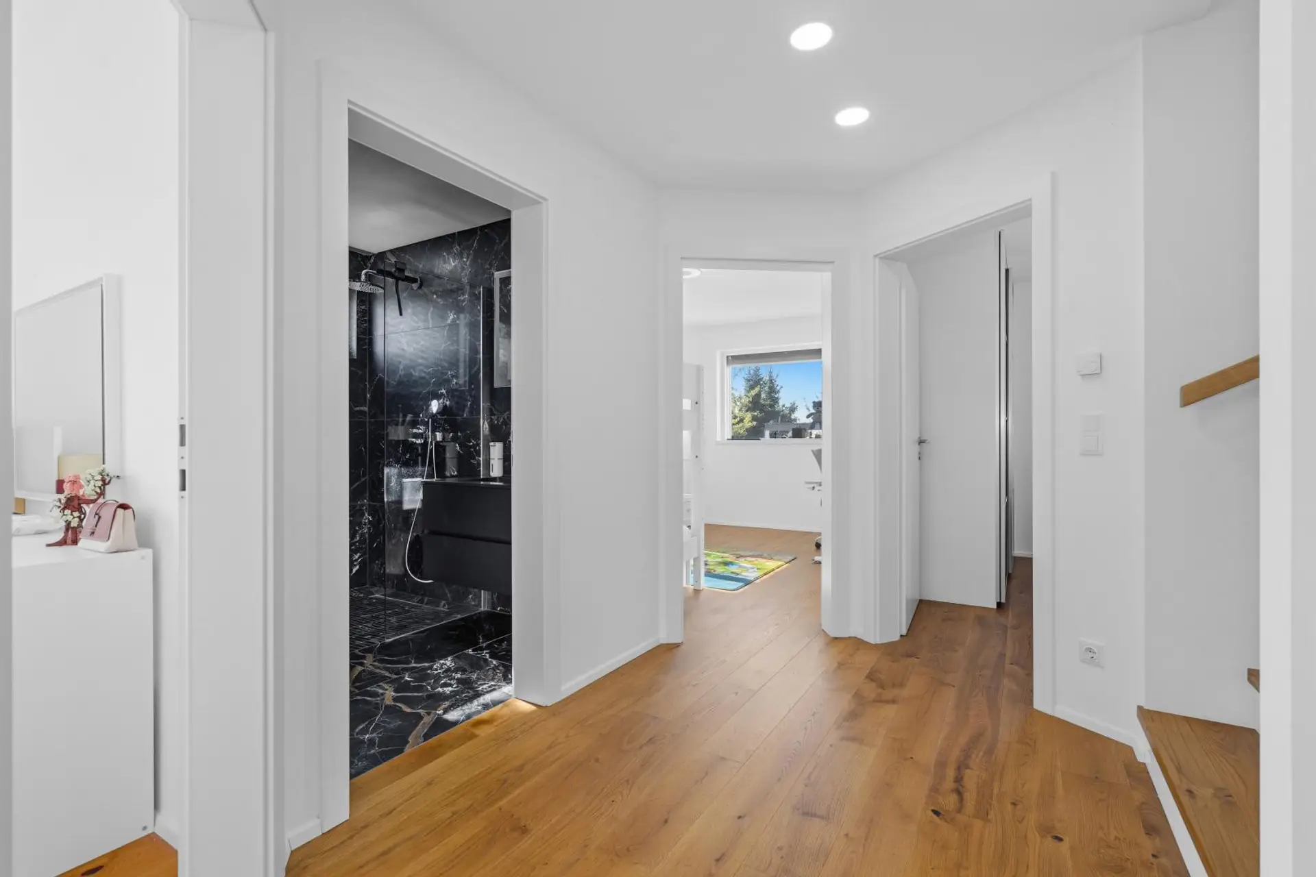 Über eine Vollholzstiege erreichen Sie das Obergeschoss, wo sich drei Schlafzimmer sowie ein exklusiv ausgestattetes Badezimmer mit Dusche und Badewanne befinden.