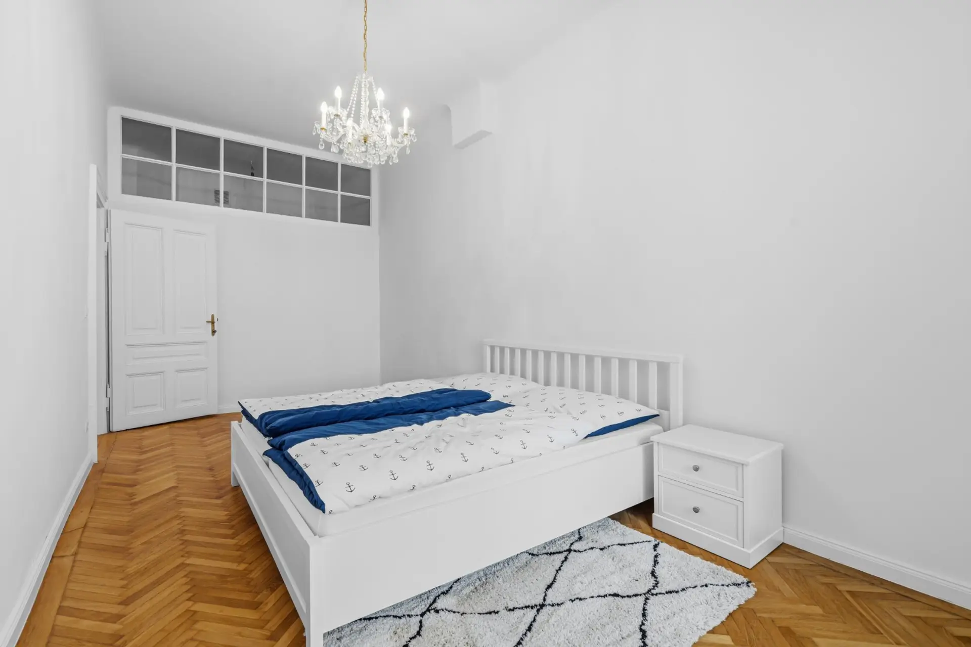 Auch im Schlafzimmer zeigt sich diese architektonische Handschrift. Das klassische Altbau-Oberlicht mit verglastem Durchgangselement bringt eine sanfte Lichtstimmung in den Raum und verleiht ihm eine besondere Ruhe und Eleganz.