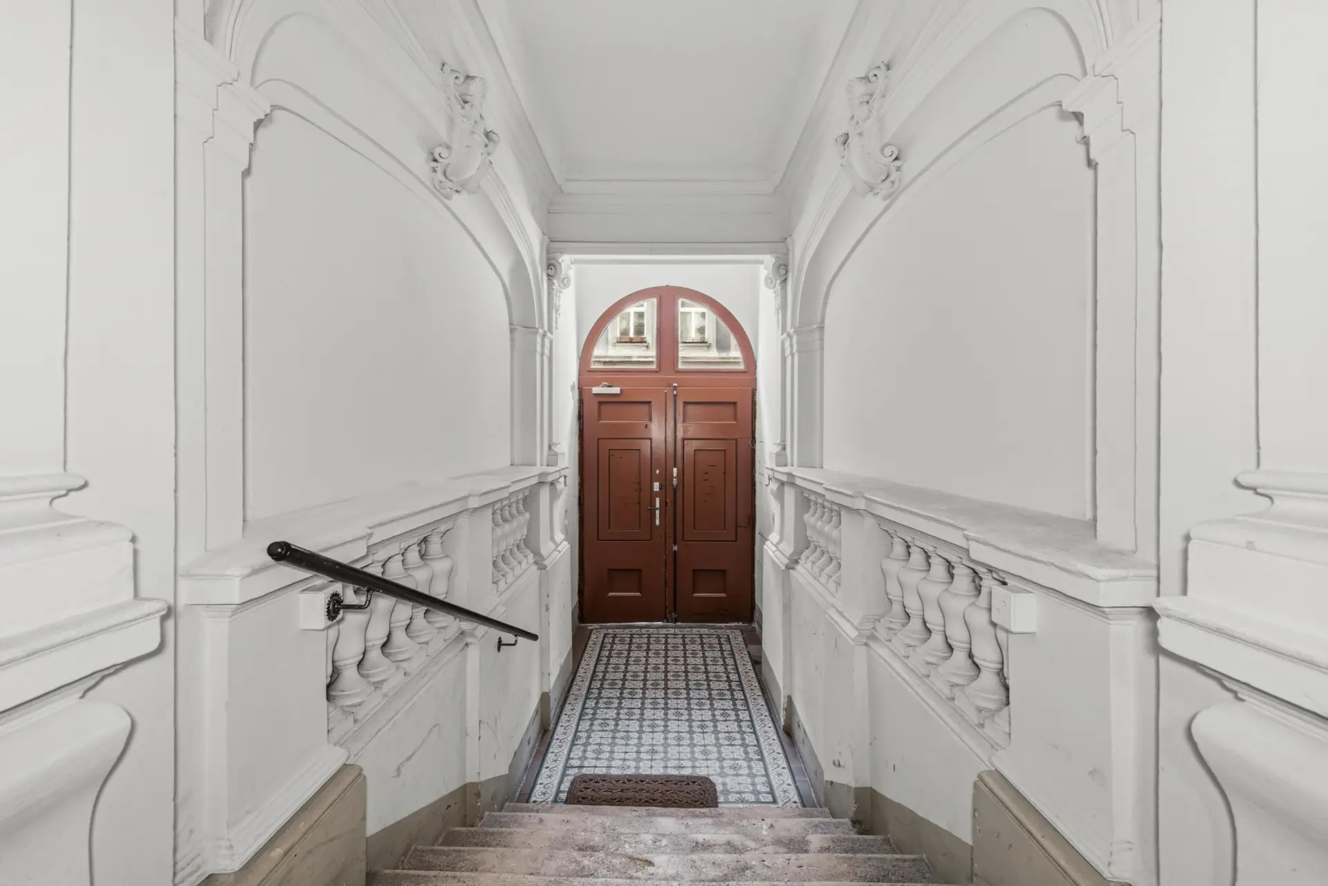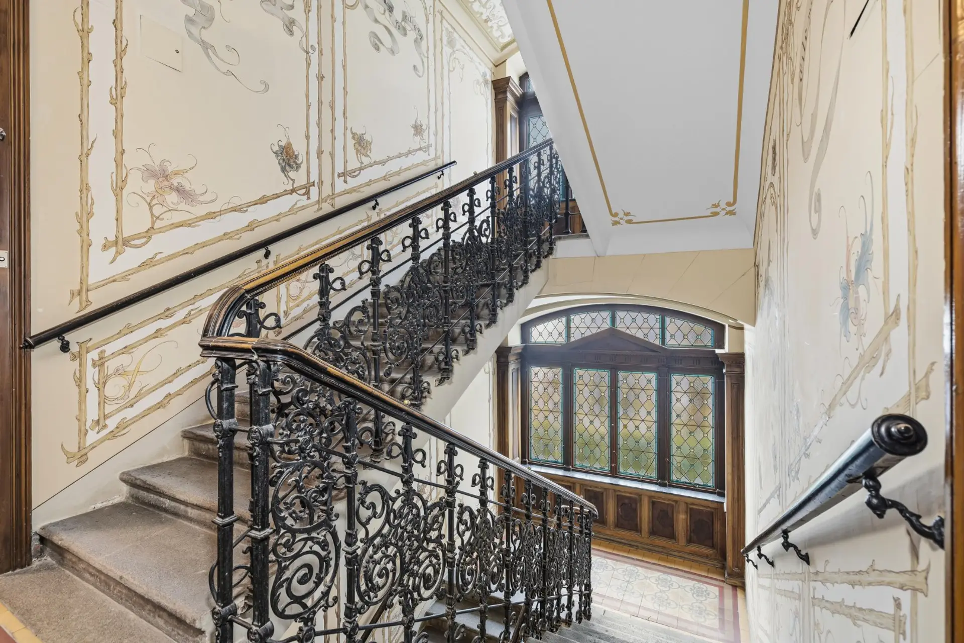 Das eindrucksvolle Stiegenhaus präsentiert sich in klassischer Wiener Altbau-Manier mit kunstvoll gearbeiteten Schmiedeeisengeländern, liebevoll erhaltenen Wandverzierungen und stilvollen Glasfenstern, die dem gesamten Entrée eine außergewöhnliche Eleganz verleihen.