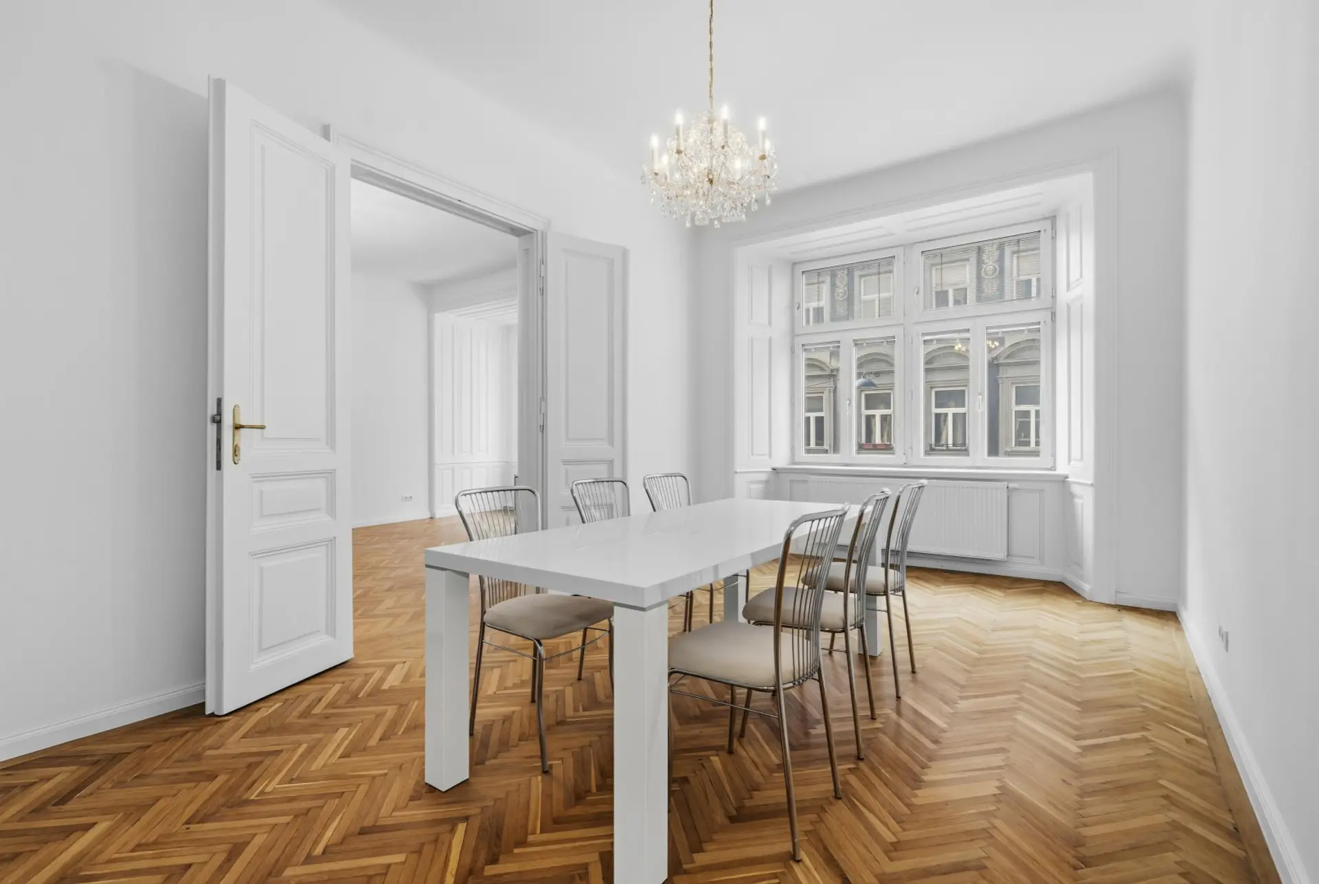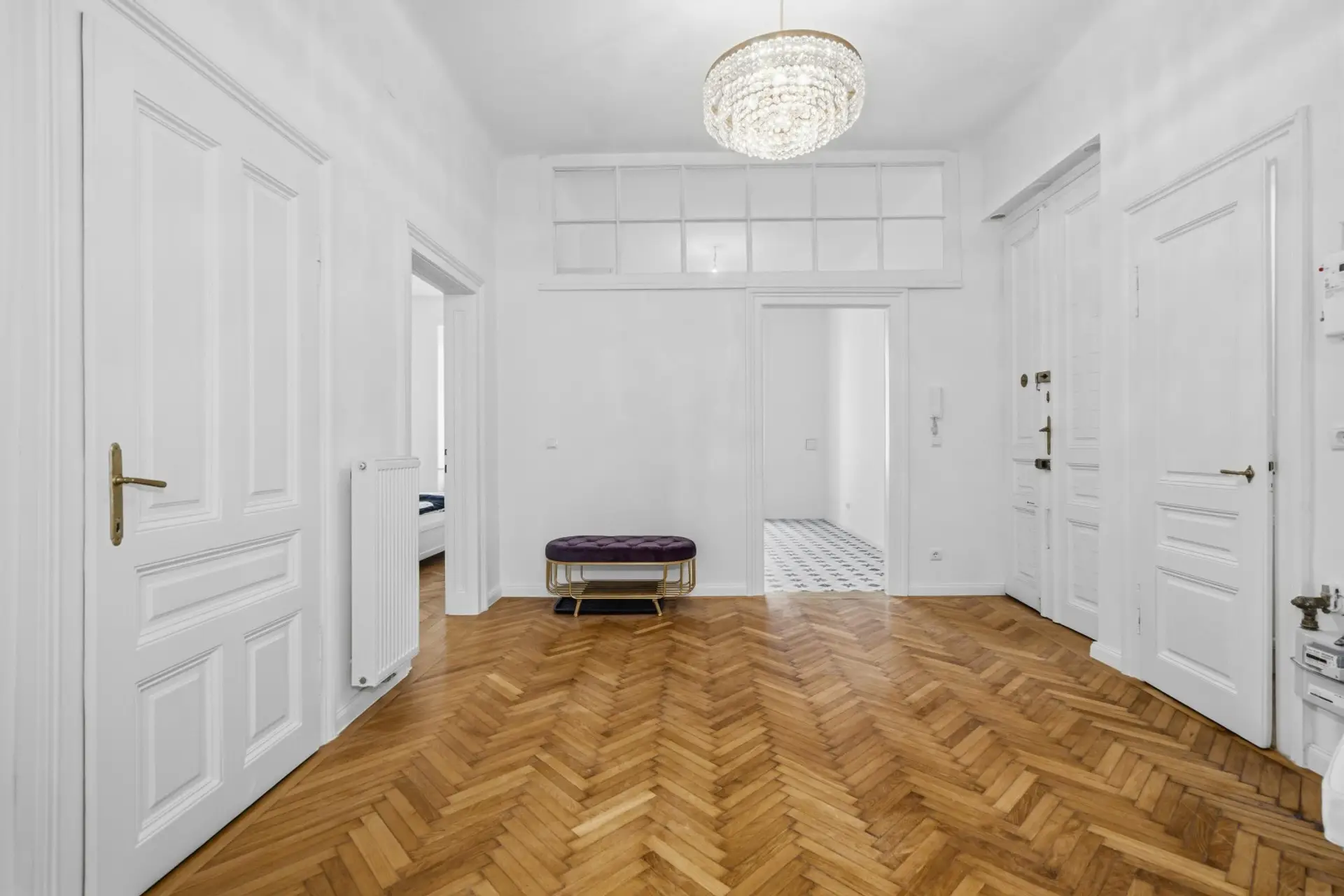Ein besonderes Detail ist hier das klassische Altbau-Oberlicht mit verglastem Durchgangselement, das den Raum zusätzlich aufwertet. Es sorgt nicht nur für eine angenehme Lichtführung, sondern verbindet die Räume auf subtile Weise miteinander – ein typisches Merkmal hochwertiger Altbauarchitektur, das heute nur noch selten in dieser Qualität zu finden ist.