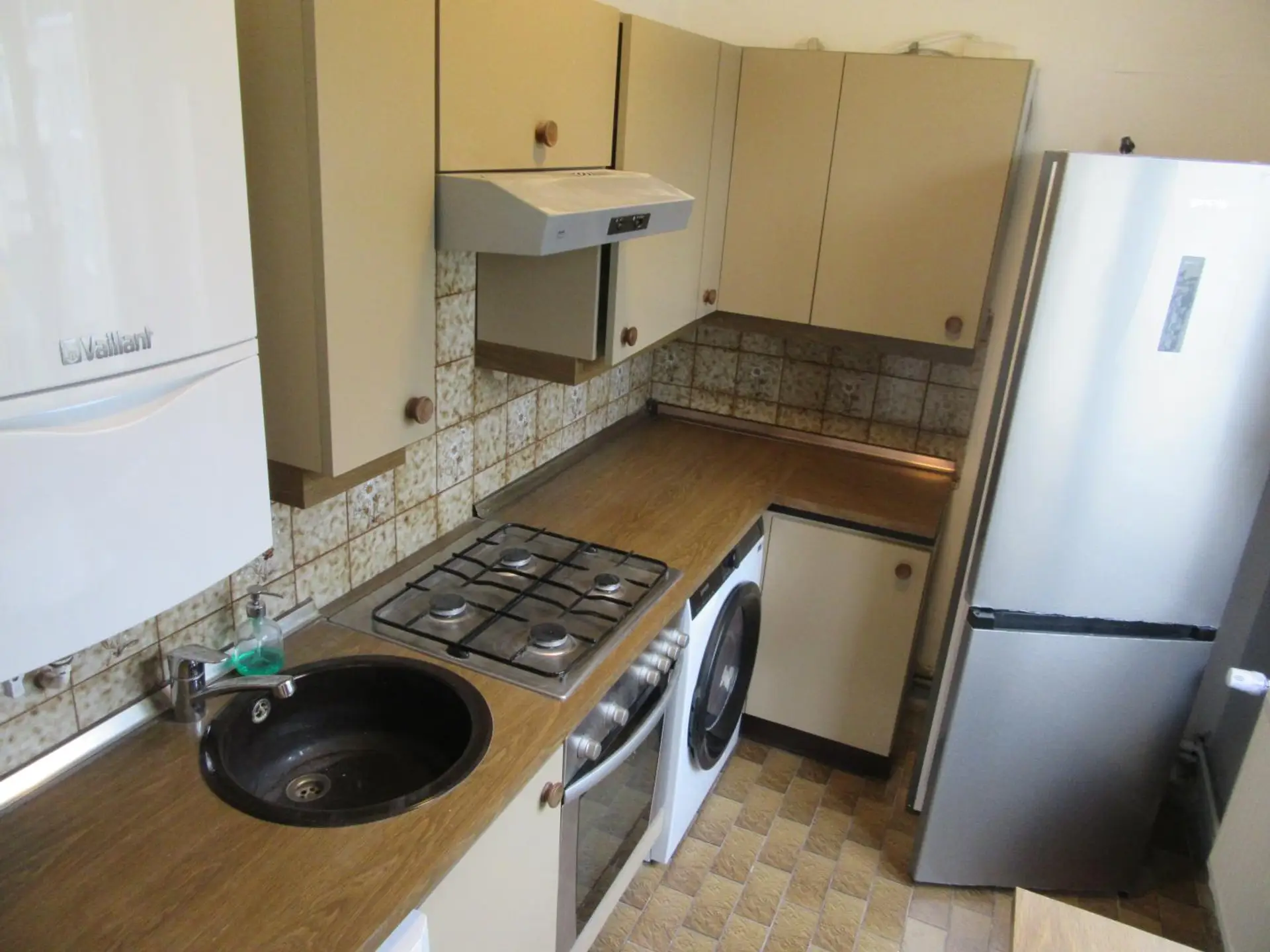 Die Küchenmöbel sind in die Jahre gekommen, aber die Küchengeräte (Geschirrspüler, Waschmaschine, Gasherd, Kühl- Gefrierkombination) sind unbenutzt.
