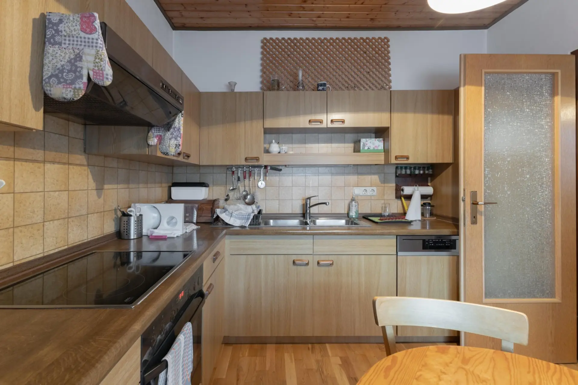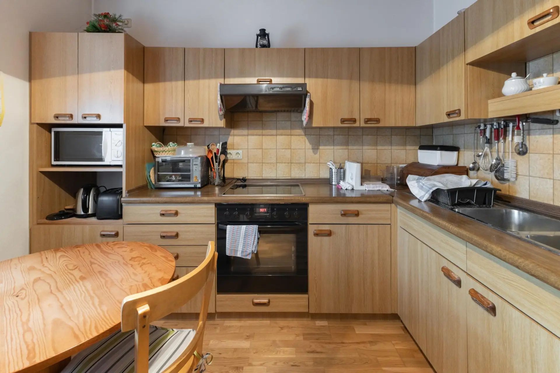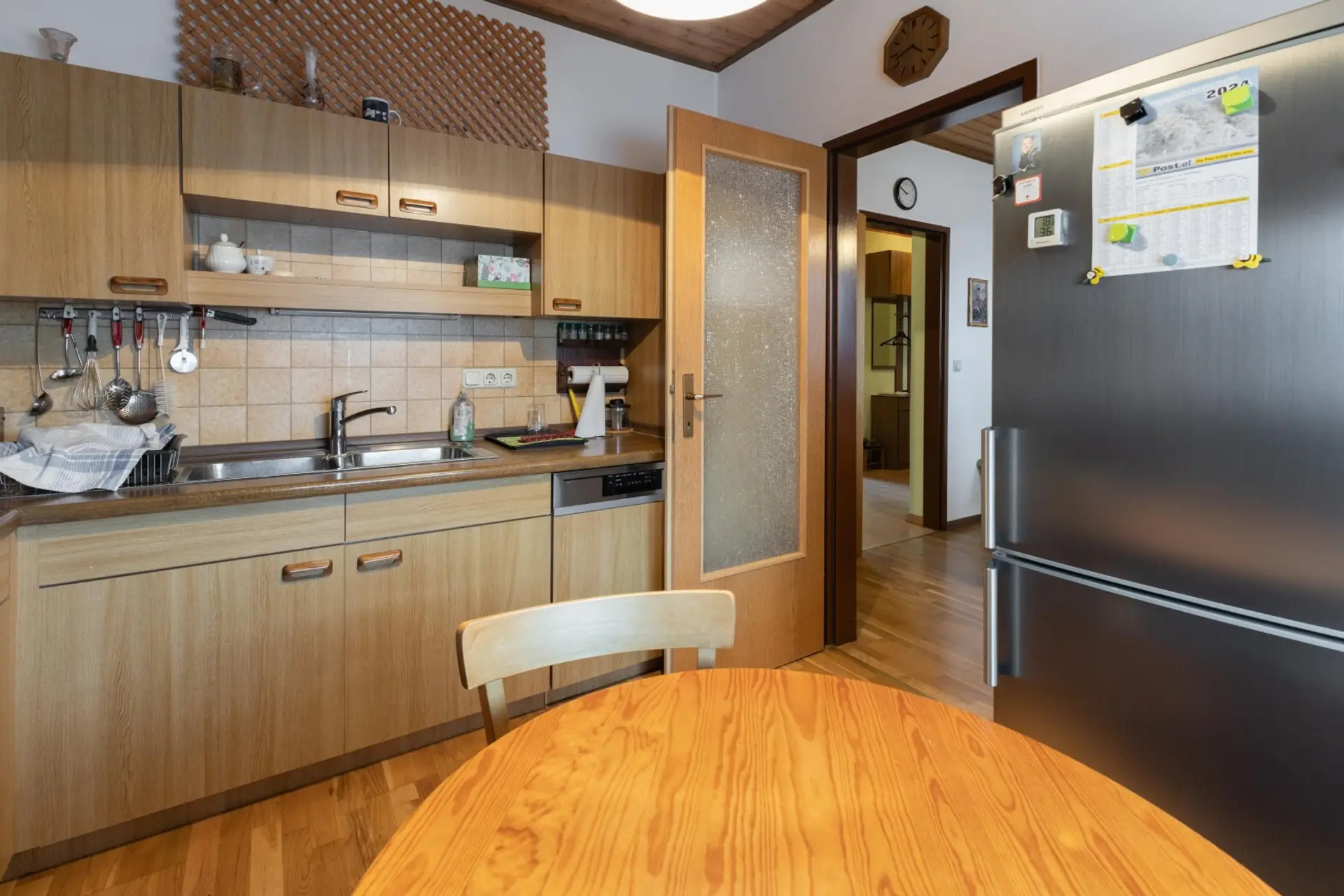 Vorzimmer, zwei Schlafzimmer, separate Küche mit Kachelofen (beheizt Vorzimmer und Wohnzimmer), Esszimmer, Wohnzimmer mit direktem Ausgang auf die Terrasse, Badezimmer, separates WC sowie ein Abstellraum.