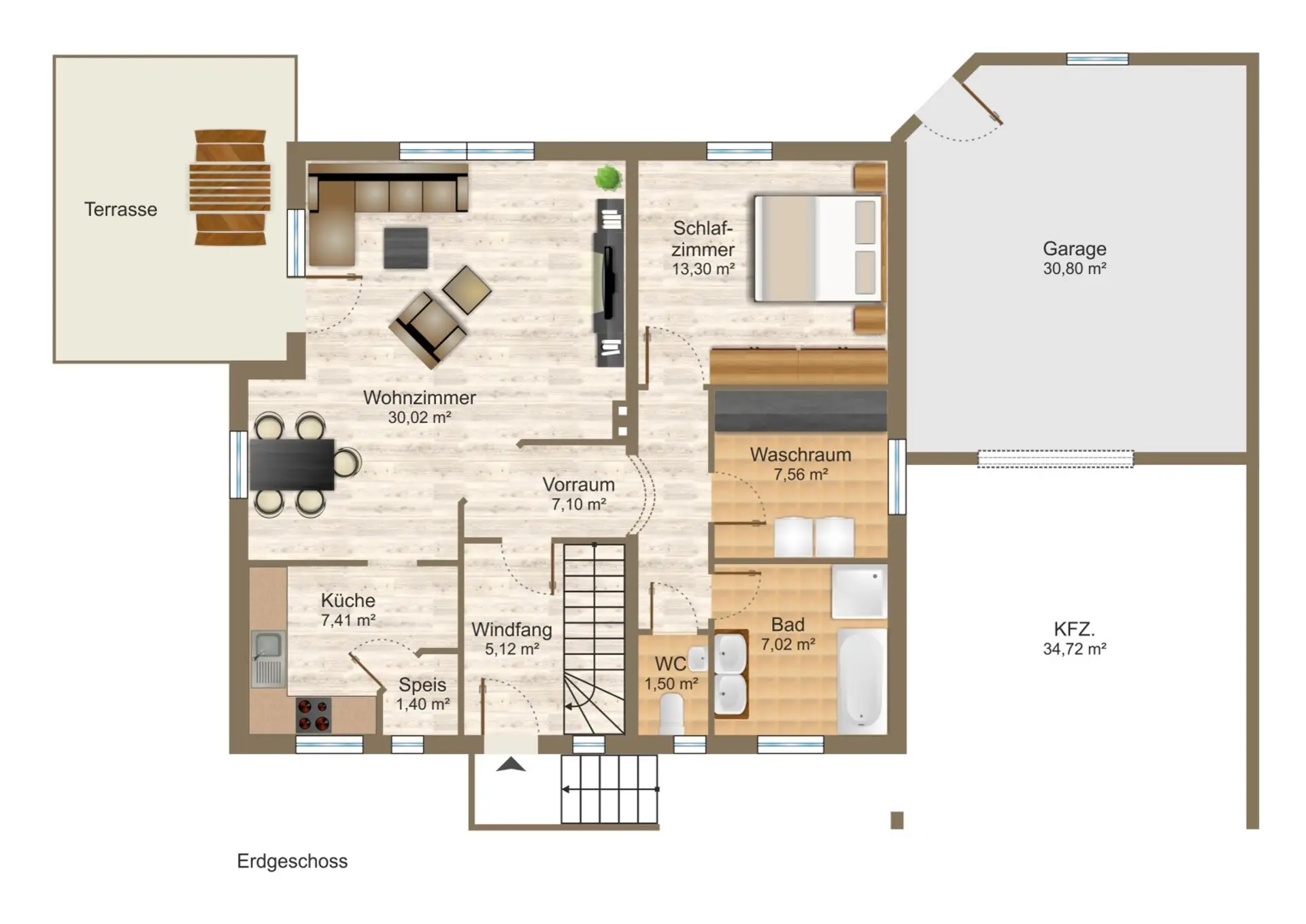 Für Autos wurde auch gesorgt – der Carport und die Garage liegen direkt an der Nachbargrenze. Hinter der Garage befindet sich eine überdachte Terrasse, ein Pool und ein kleines Biotop. Die Südterrasse ist direkt aus dem Wohnzimmer erreichbar.