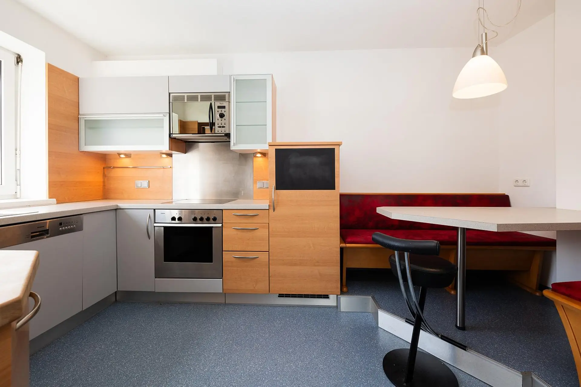 Ein Kachelofen im Wohnbereich sorgt für angenehme Wärme und ein behagliches Wohnklima sowie für eine effiziente Zusatzheizung. Das Schlafzimmer ist separat gelegen und ruhig ausgerichtet.