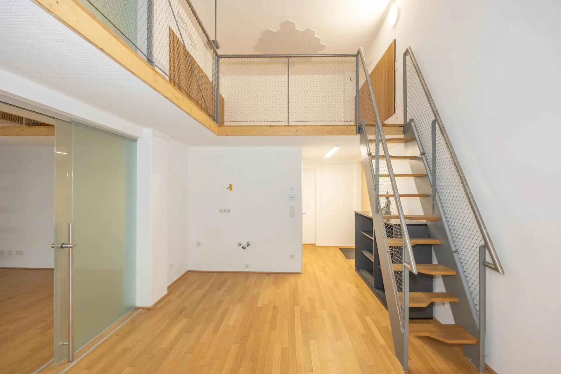 Ein nachträglich eingebautes Galeriemöbel (rückbaubar) schafft zusätzliche Nutzfläche. Die lichten Raumhöhen ober- und unterhalb der Galerie betragen jeweils ca. 2,2m.