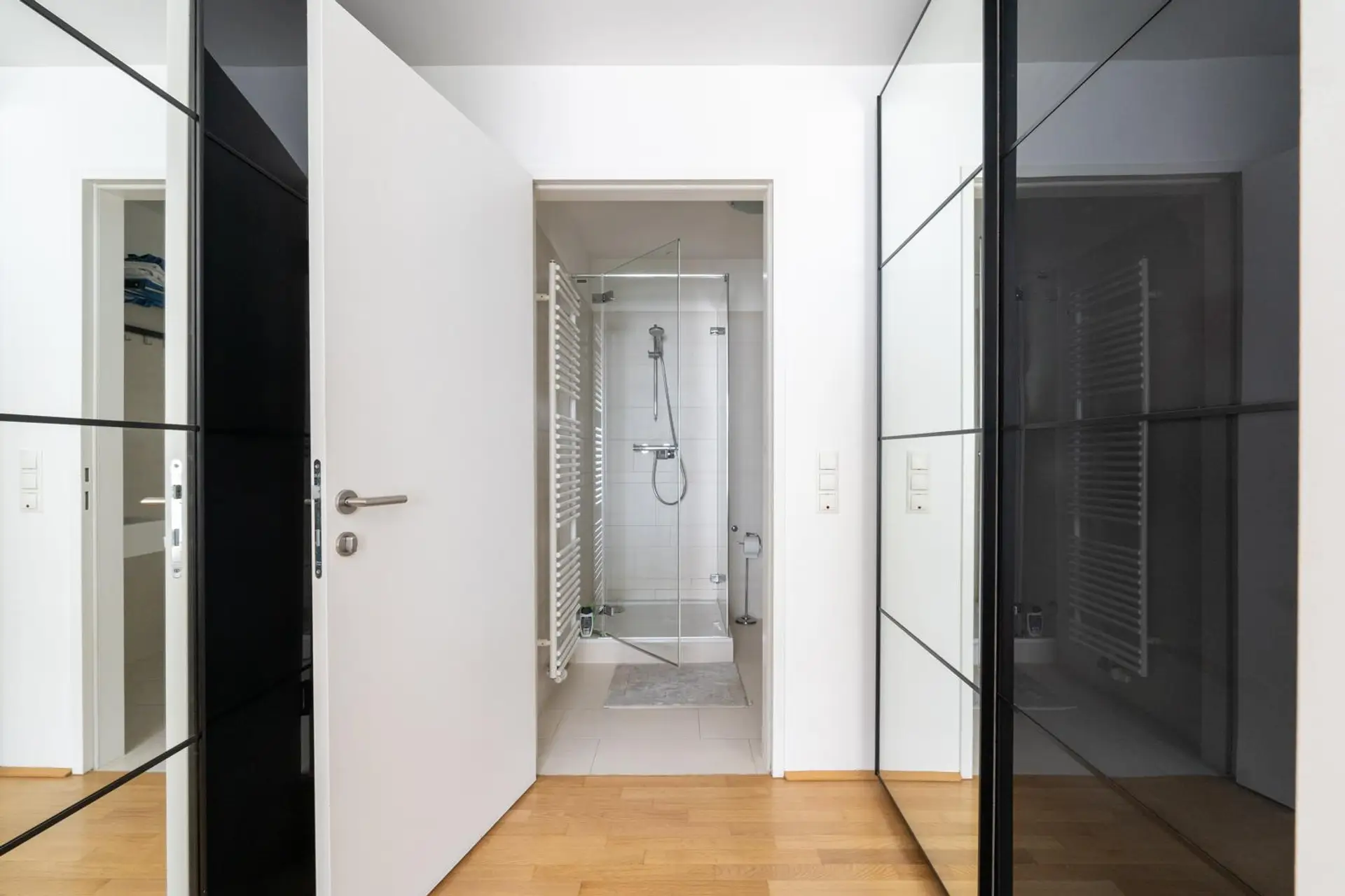 Das Hauptschlafzimmer mit eigenem Bad hat einen geräumigen begehbaren Kleiderschrank. Das private Hauptbadezimmer ist elegant in neutralen Farben verfliest und verfügt über eine Duschkabine, einen beheizten Handtuchhalter, ein Handwaschbecken, eine individuell einstellbare Fußbodenheizung und ein WC.