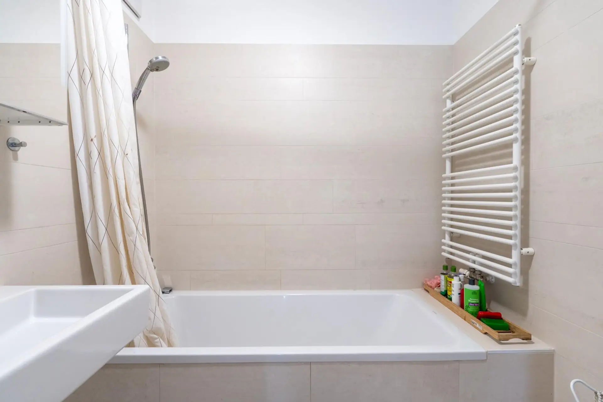 Das zweite Badezimmer ist mit einer Badewanne, beheizten Handtuchhaltern, einem Waschmaschinenanschluss und einer individuell einstellbaren Fußbodenheizung ausgestattet, um den persönlichen Komfort zu maximieren. Die Wohnung verfügt außerdem über ein separates Gäste-WC.