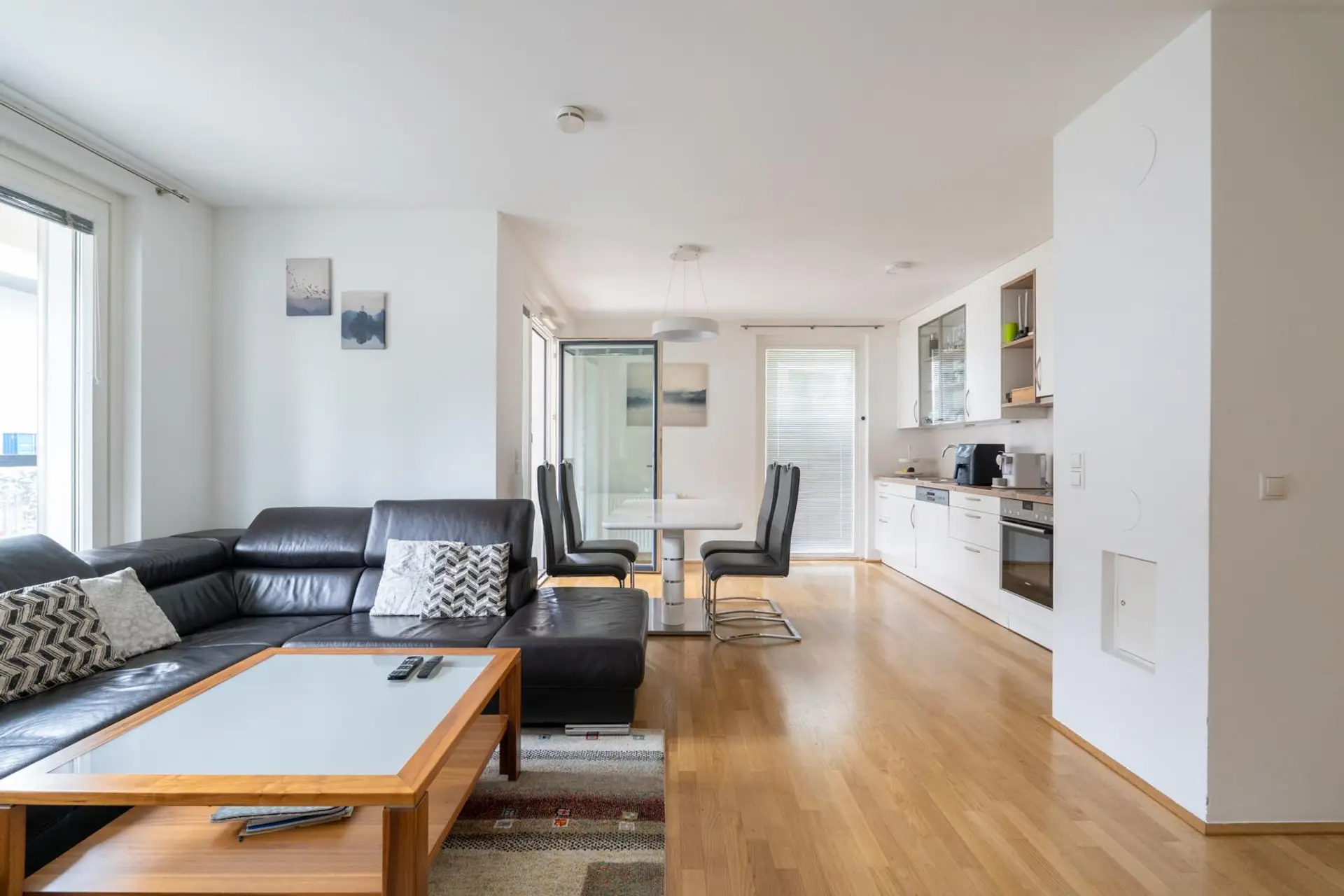 The fully equipped living room/ kitchen is flooded with daylight and leads to the terrace/loggia, where you can enjoy a barbeque or an evening drink with expansive views.
