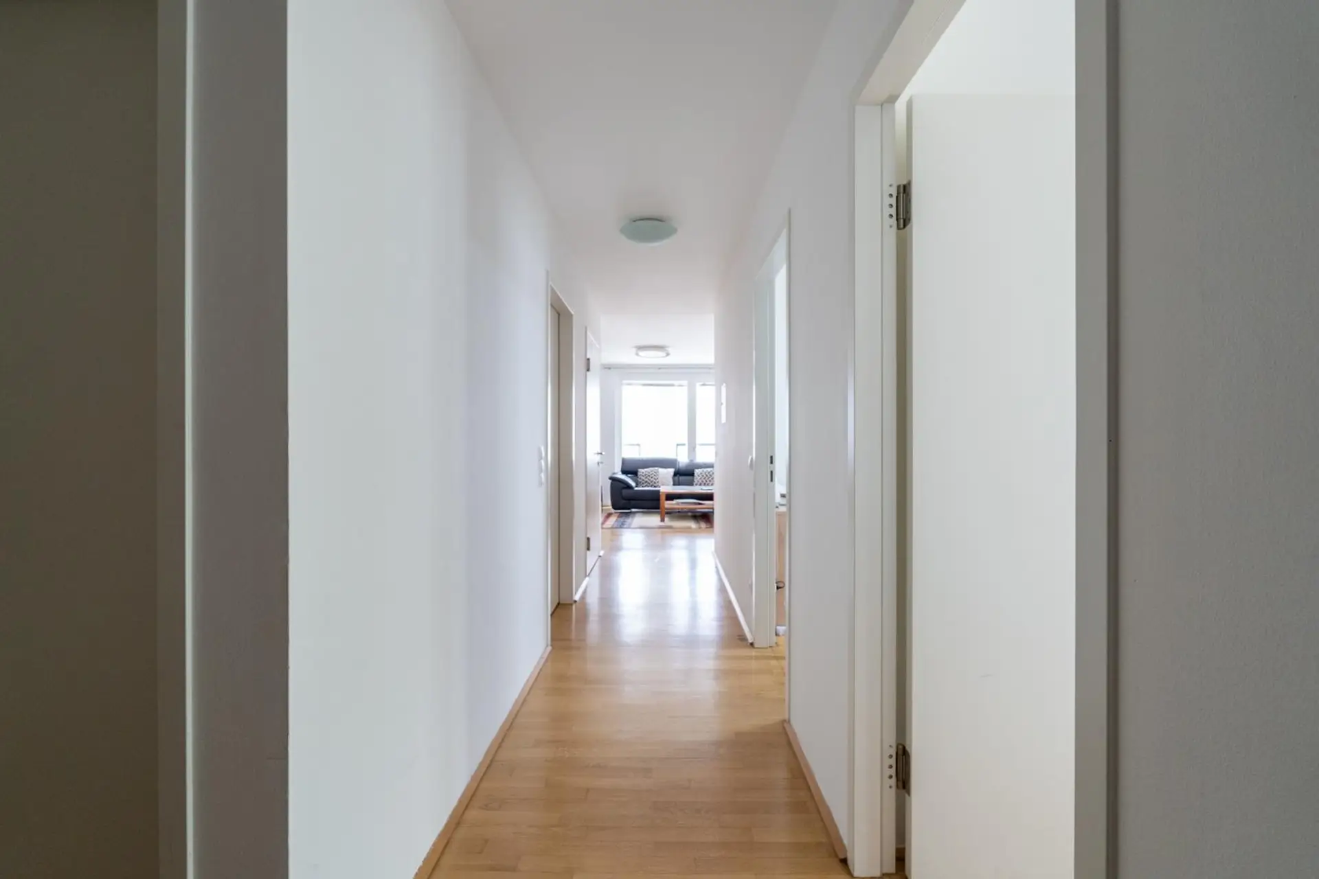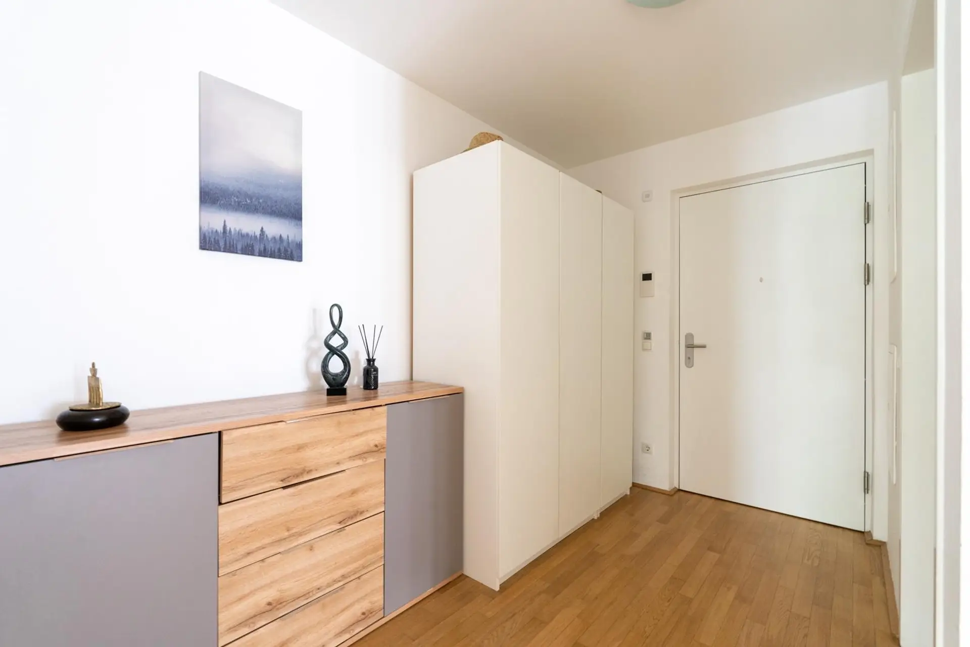The second bathroom is equipped with a bathtub, heated towel rails, a washing machine connection and programmable underfloor heating to maximise personal comfort. The apartment also has a separate guest WC.