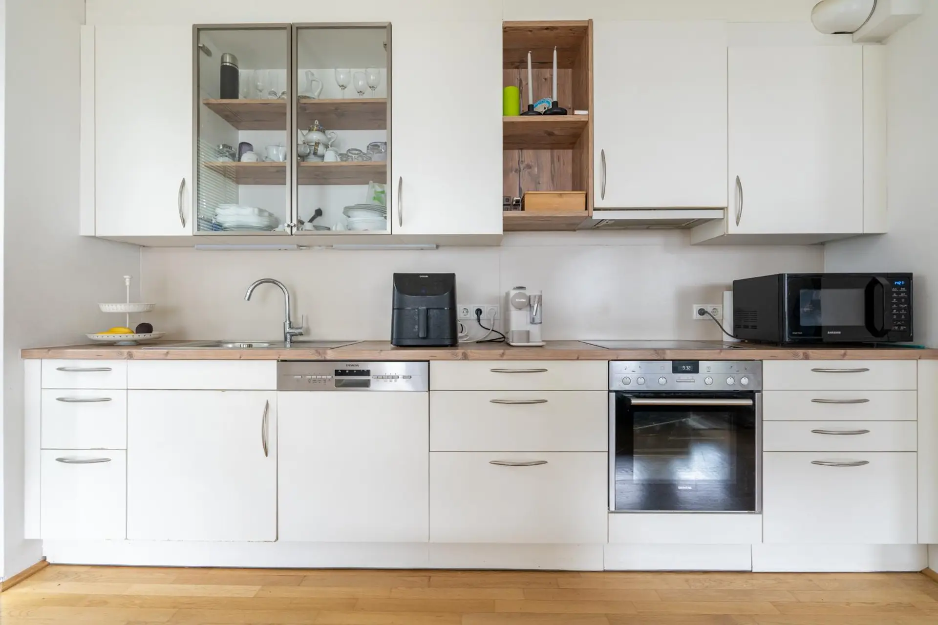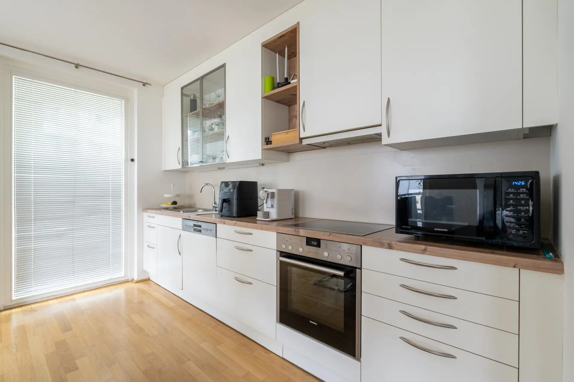 Die voll ausgestattete Wohnküche ist lichtdurchflutet und führt auf den Balkon, wo Sie einen Grillabend oder einen abendlichen Drink mit weitem Blick genießen können.