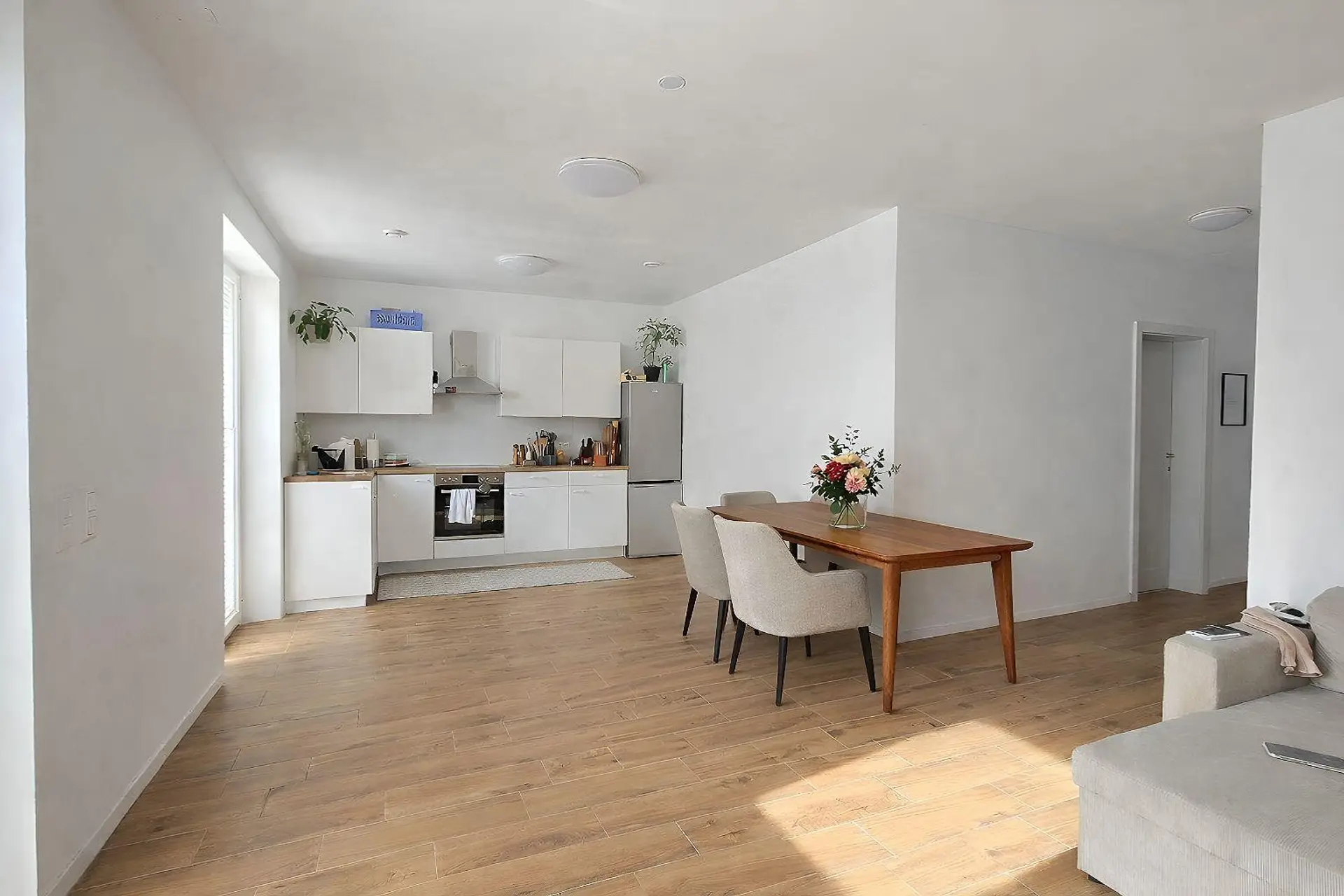 Der lichtdurchflutete Wohnbereich bildet das Herzstück des Hauses und bietet direkten Zugang zur Terrasse und in den Garten – perfekt für entspannte Stunden im Freien, gesellige Abende oder Familienzeit.