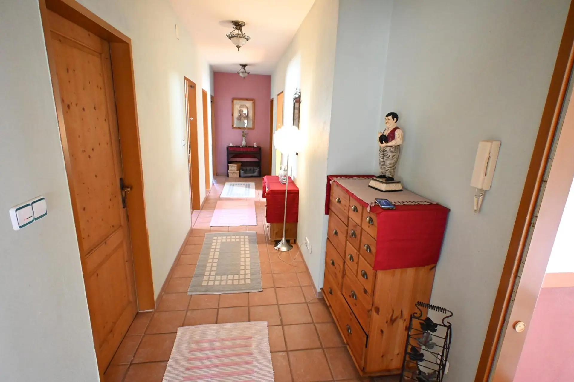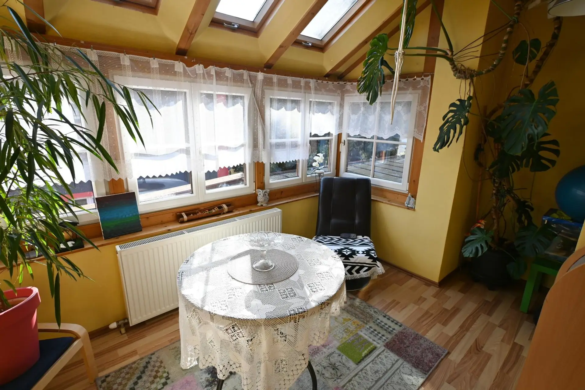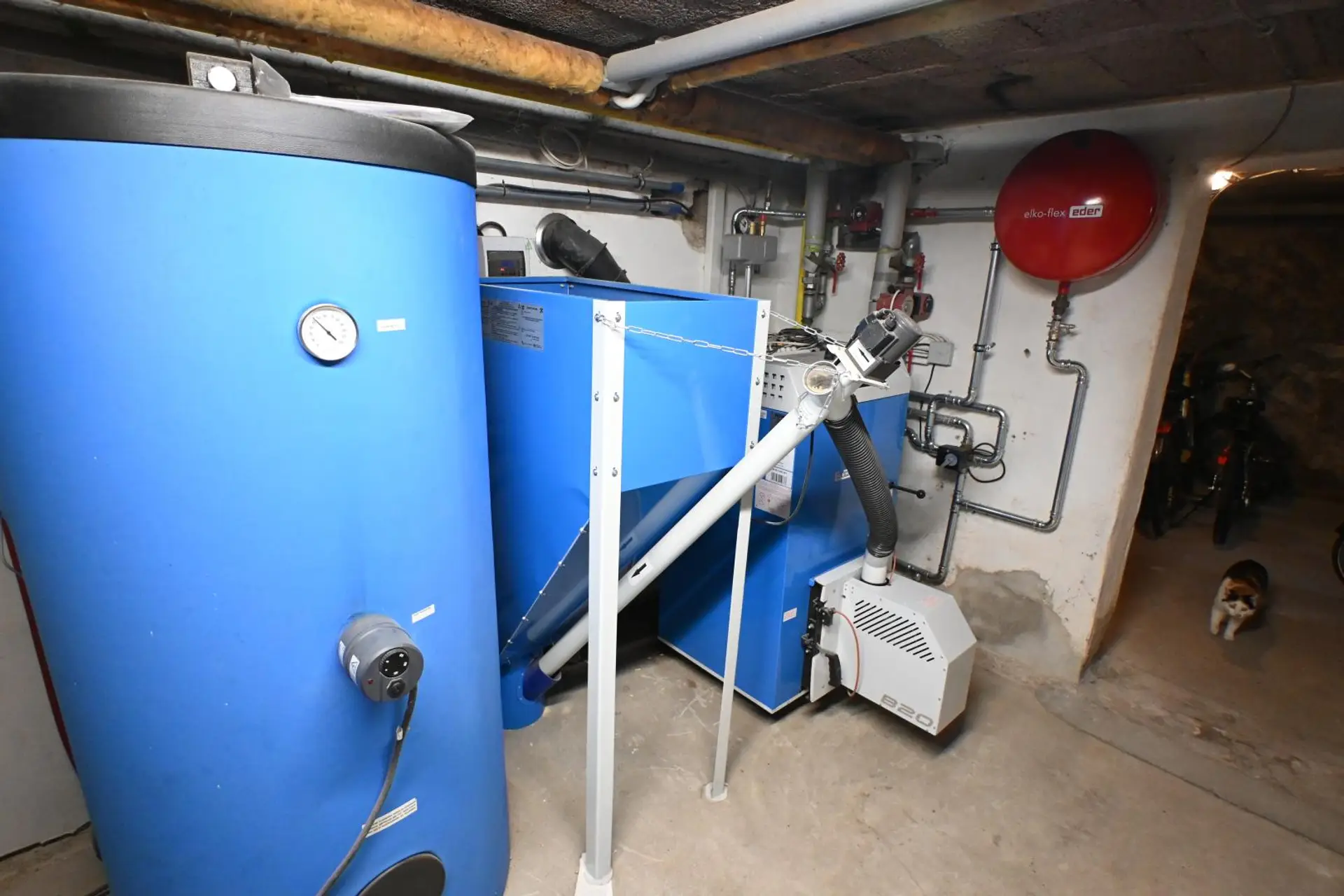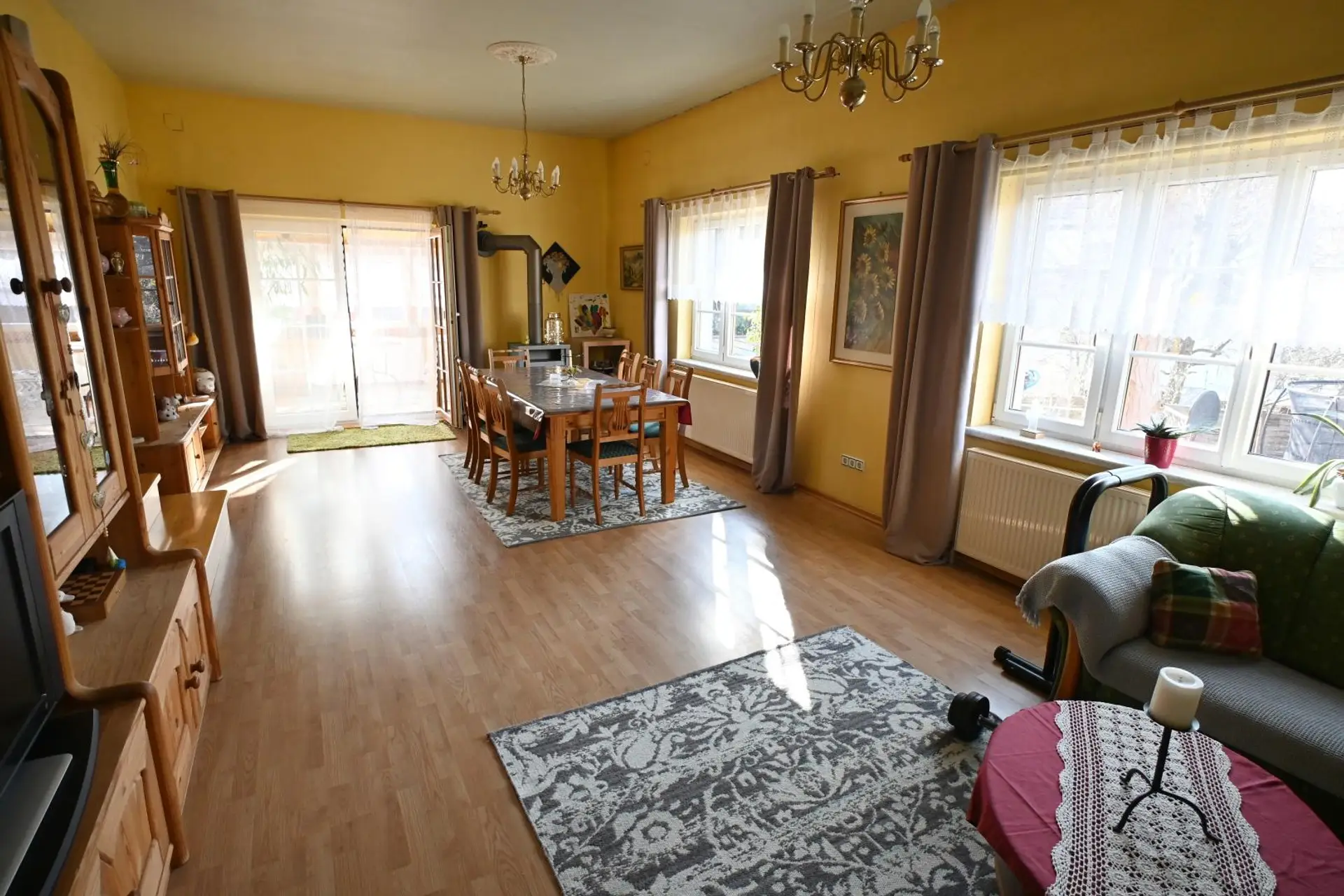 Weiters steht ein Garten mit Terrasse zur Verfügung sowie eine große Garage/Werkstatt (2 PKW, ca. 50 m²). Für Heizung und Warmwasser (Boiler 500l) ist eine Pellets-Zentralheizung in Kombination mit Photovoltaik zuständig.