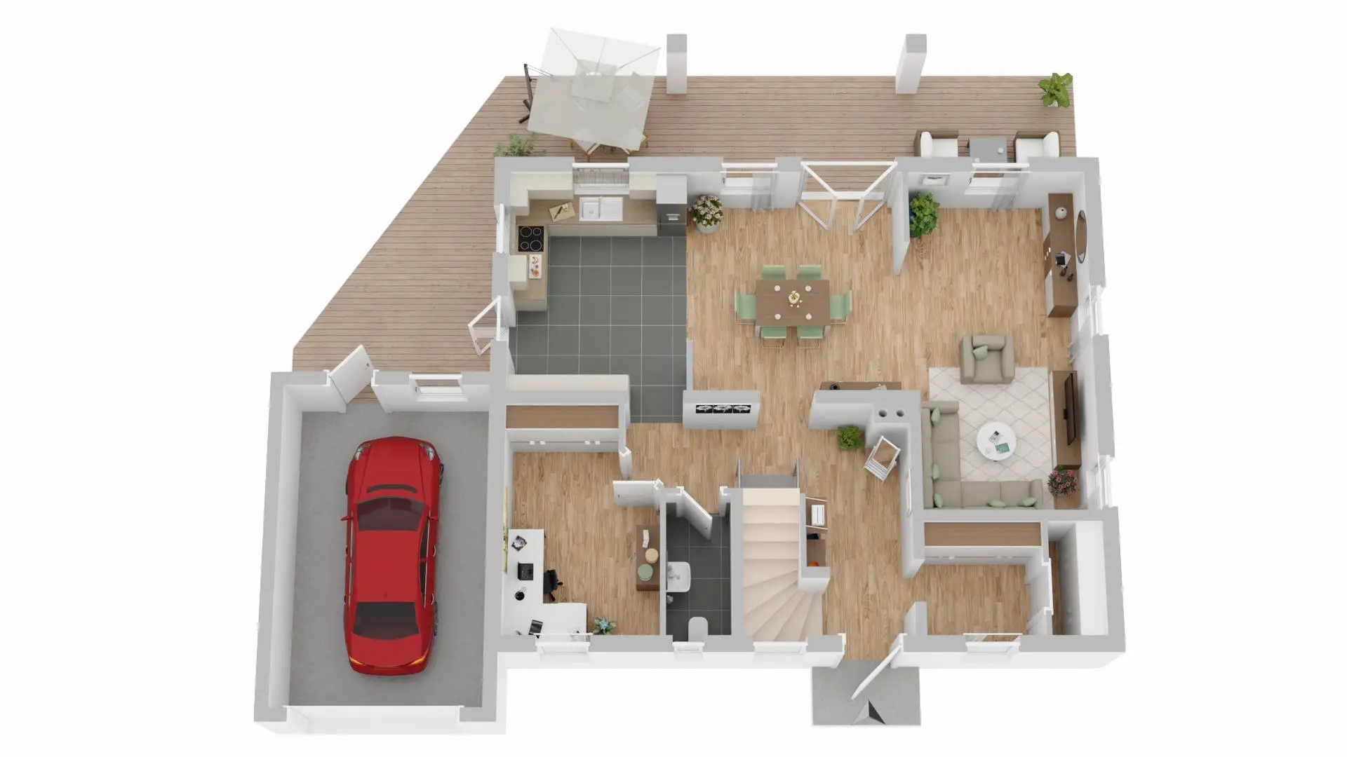 Herzstück ist im Erdgeschoß der Wohnbereich mit der angrenzenden Küche und dem Ausgang auf die wettergeschützte Terrasse.