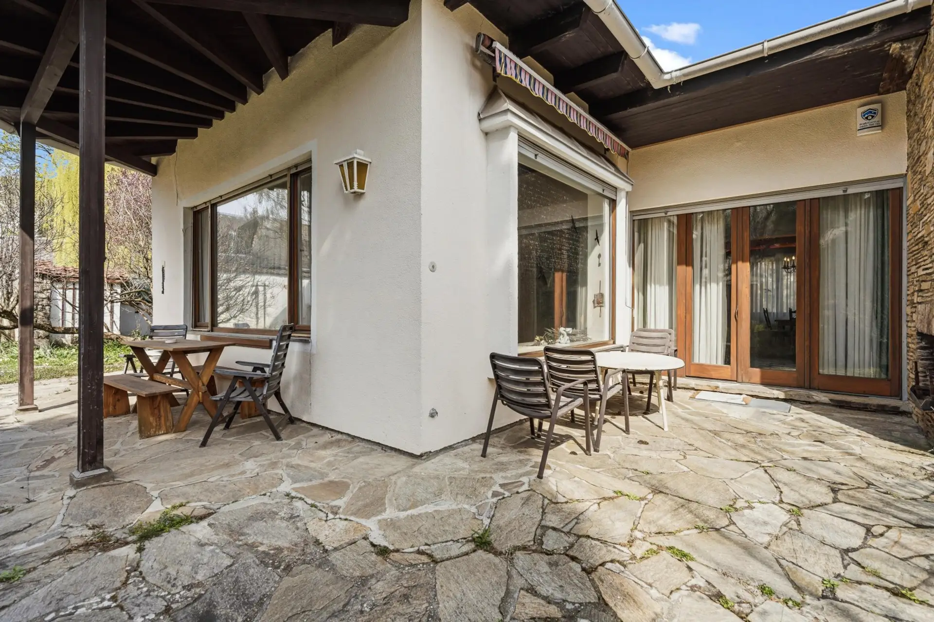 Große, sonnige Terrasse mit Blick über das Grundstück
