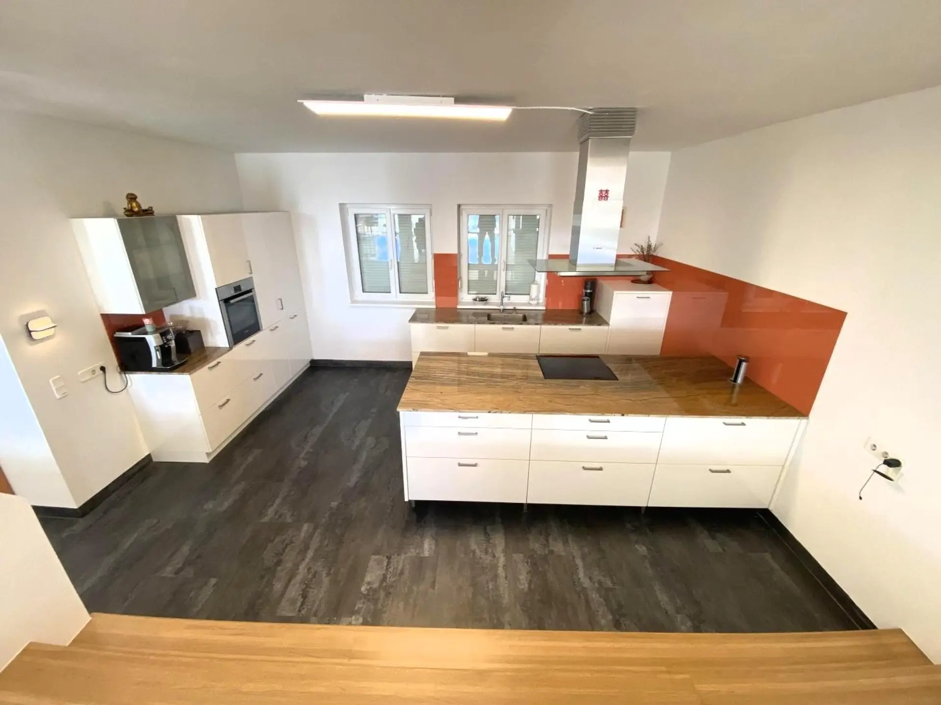 Die 2002 errichtete und 2025 renovierte Villa selber ist sehr großzügig angelegt, mit einem im Erdgeschoß offenen Küchen-, Ess- und Wohnbereich (zusammen ca. 120 m²), von dem man auf eine südseitig ausgerichtete, 36m² große balkonartige Terrasse gelangt. Der Garten ist über eine Treppe direkt erreichbar. Die Küche besticht mit einer exquisiten Ausstattung, Granitoberplatten und einer Kücheninsel.