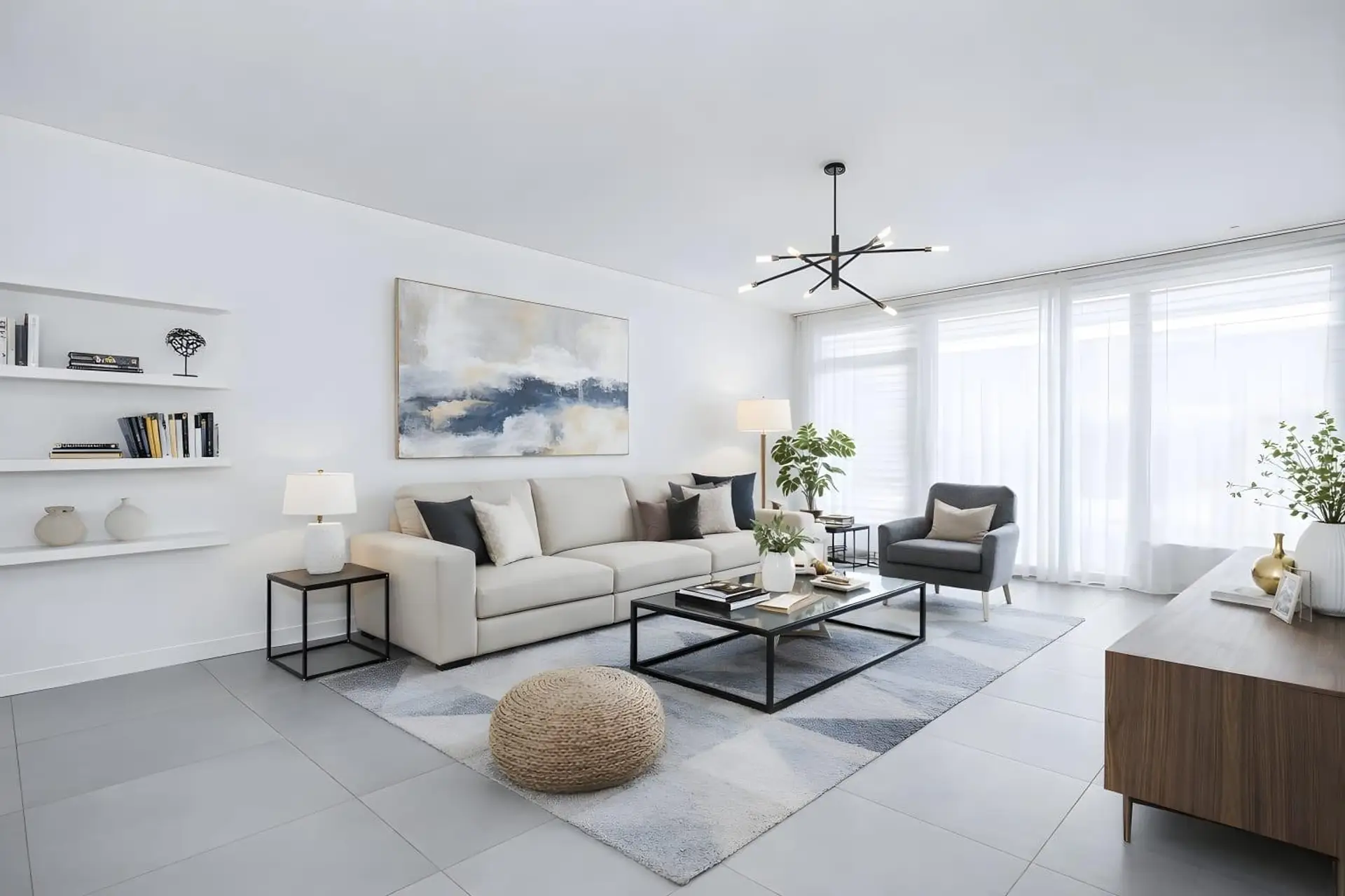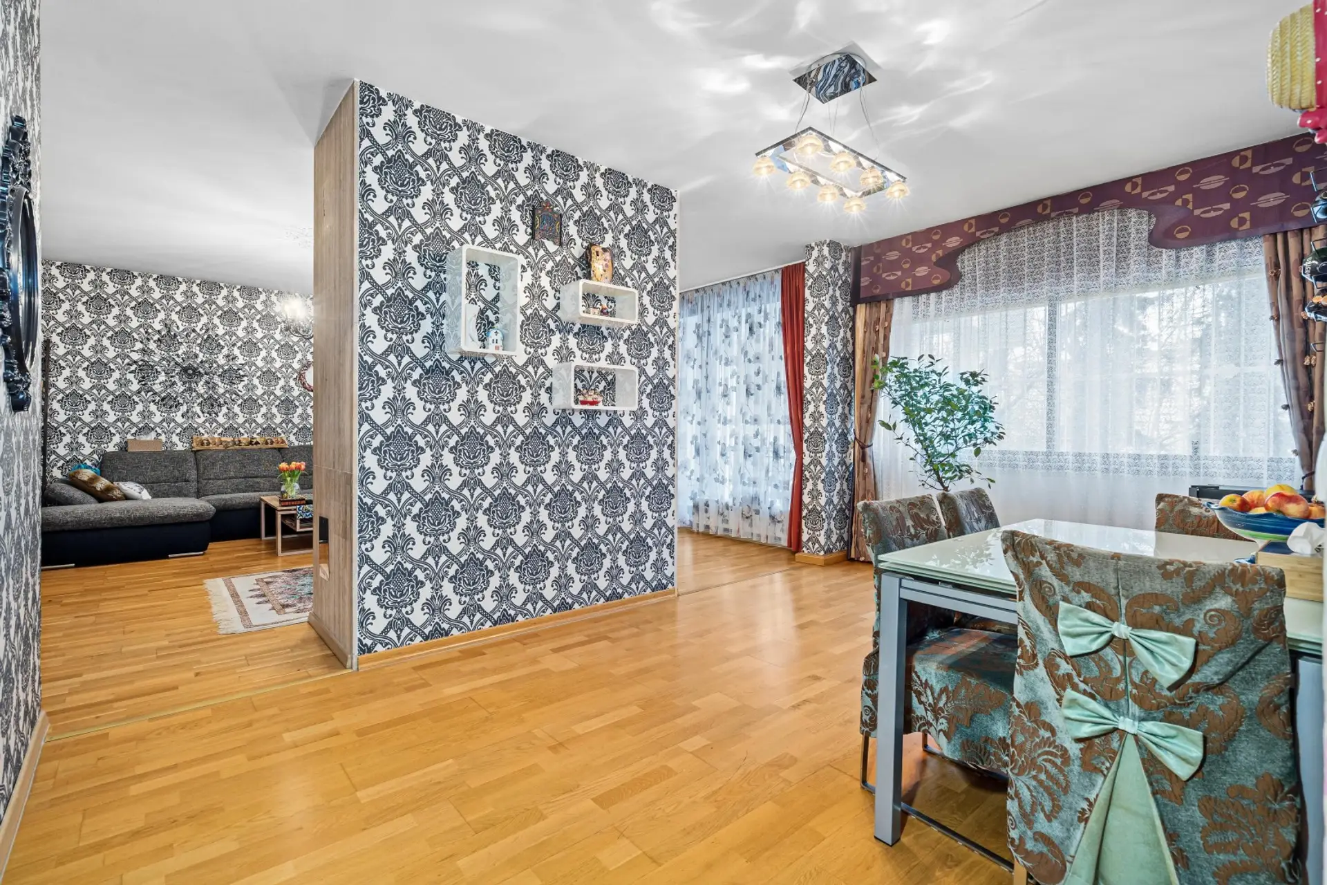 Prestigious living room with direct access to the balcony, stylishly separated from the dining area by a fireplace