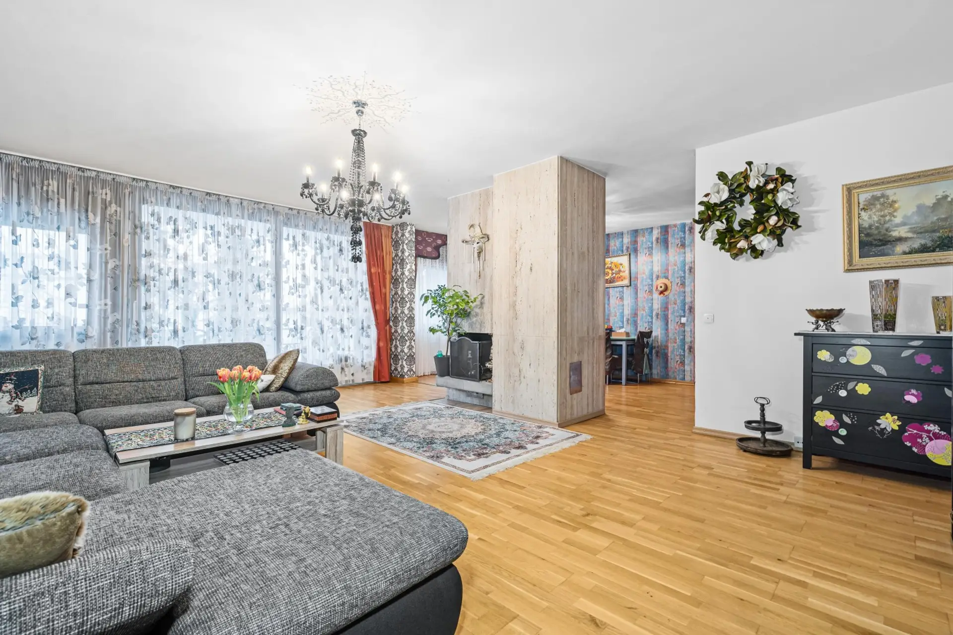Repräsentatives Wohnzimmer direkter Ausgang auf den Balkon, durch einen stilvollen Kamin vom Essbereich getrennt