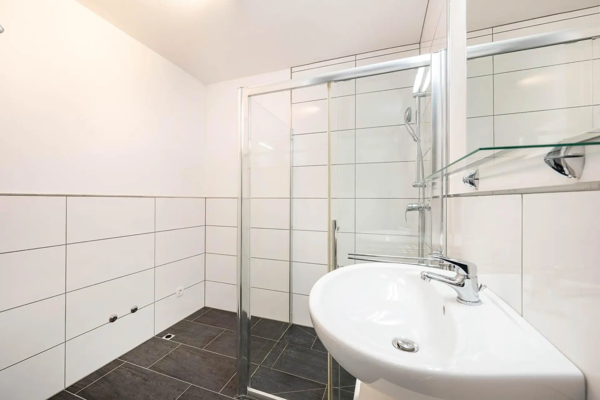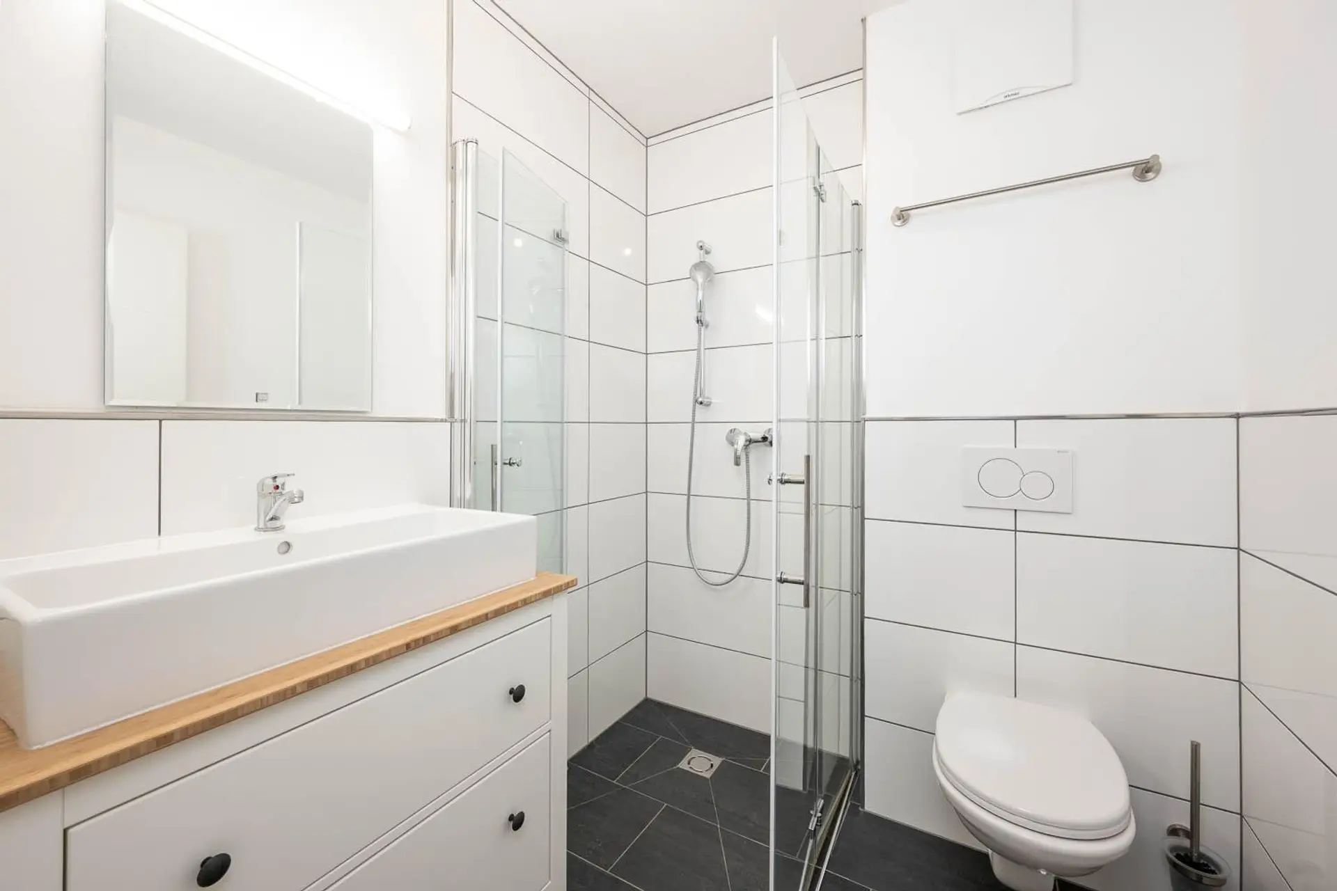 Die Wohnung überzeugt zudem durch hochwertige Materialien, stilvolle Badezimmer sowie elegante Holzböden, die für ein warmes Wohngefühl sorgen.