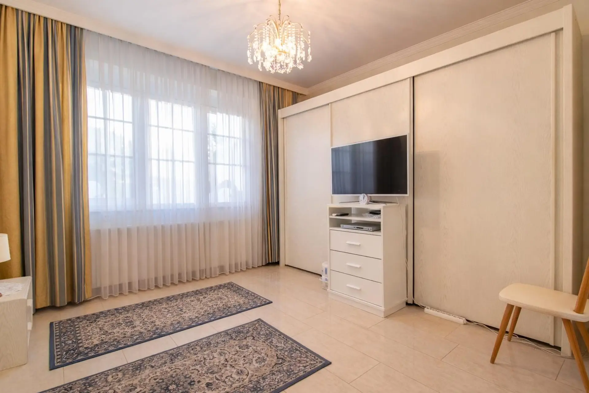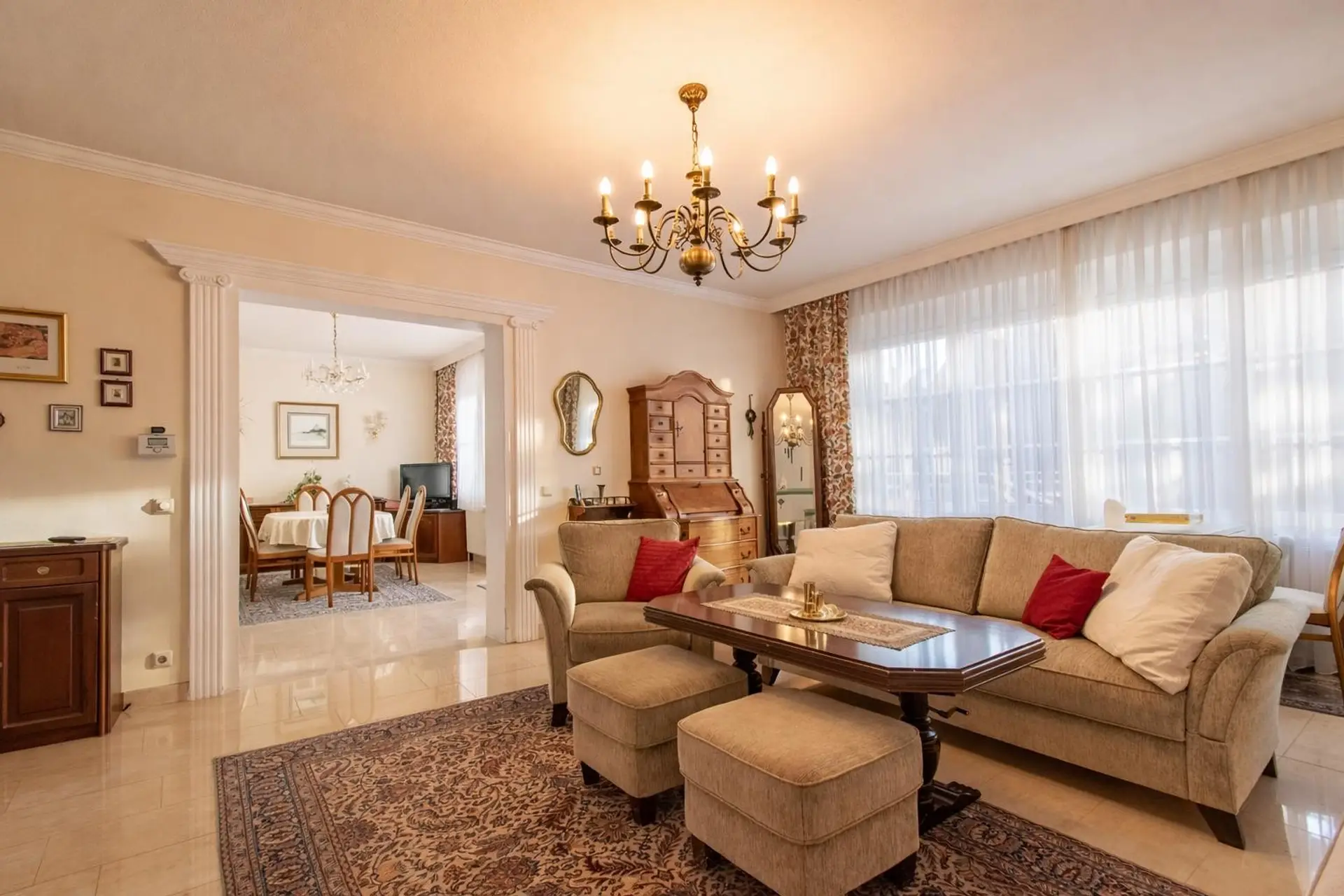Zwei Schlafzimmer – eines davon mit praktischem Schrankraum – bieten Rückzugsmöglichkeiten, während das helle Wohnzimmer und das separate Esszimmer ideale Orte für gemeinsames Leben und Entspannen darstellen.