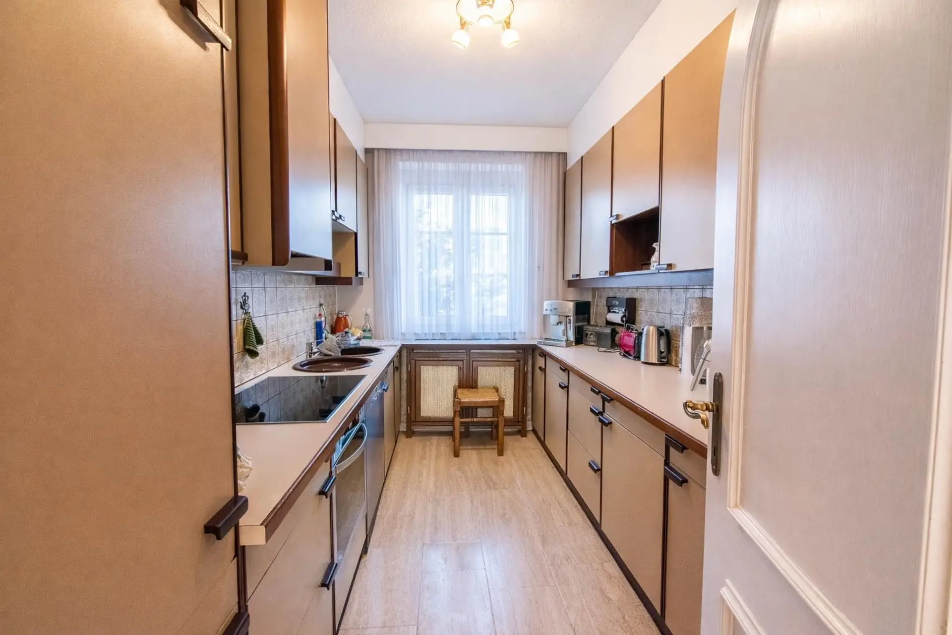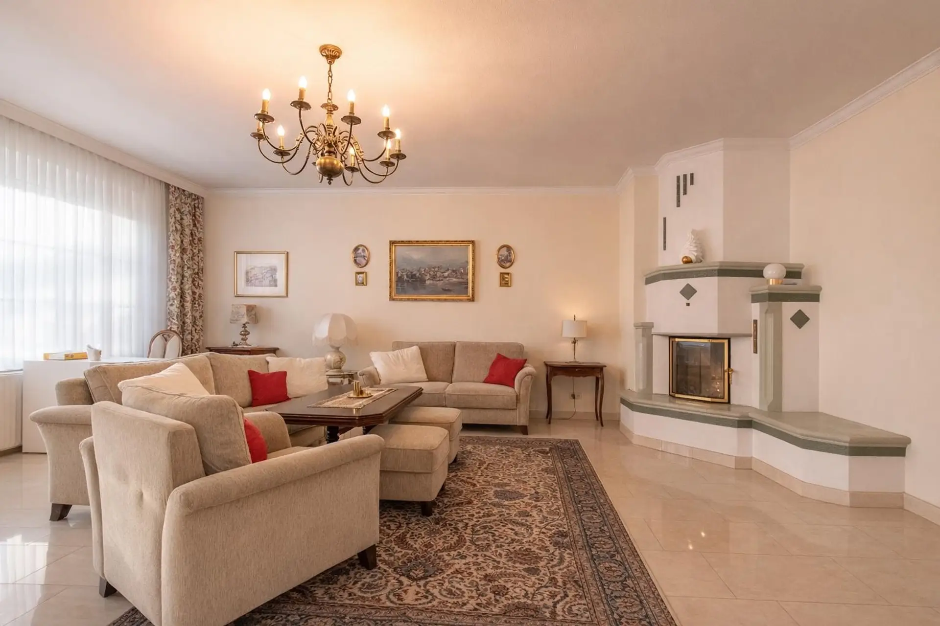 Eine Küche, eine Diele, ein geräumiges Badezimmer mit Eckwanne, Doppelwaschbecken, WC und Bidet sowie ein zusätzlicher Sanitärbereich mit Dusche und WC sorgen für hohen Wohnkomfort.