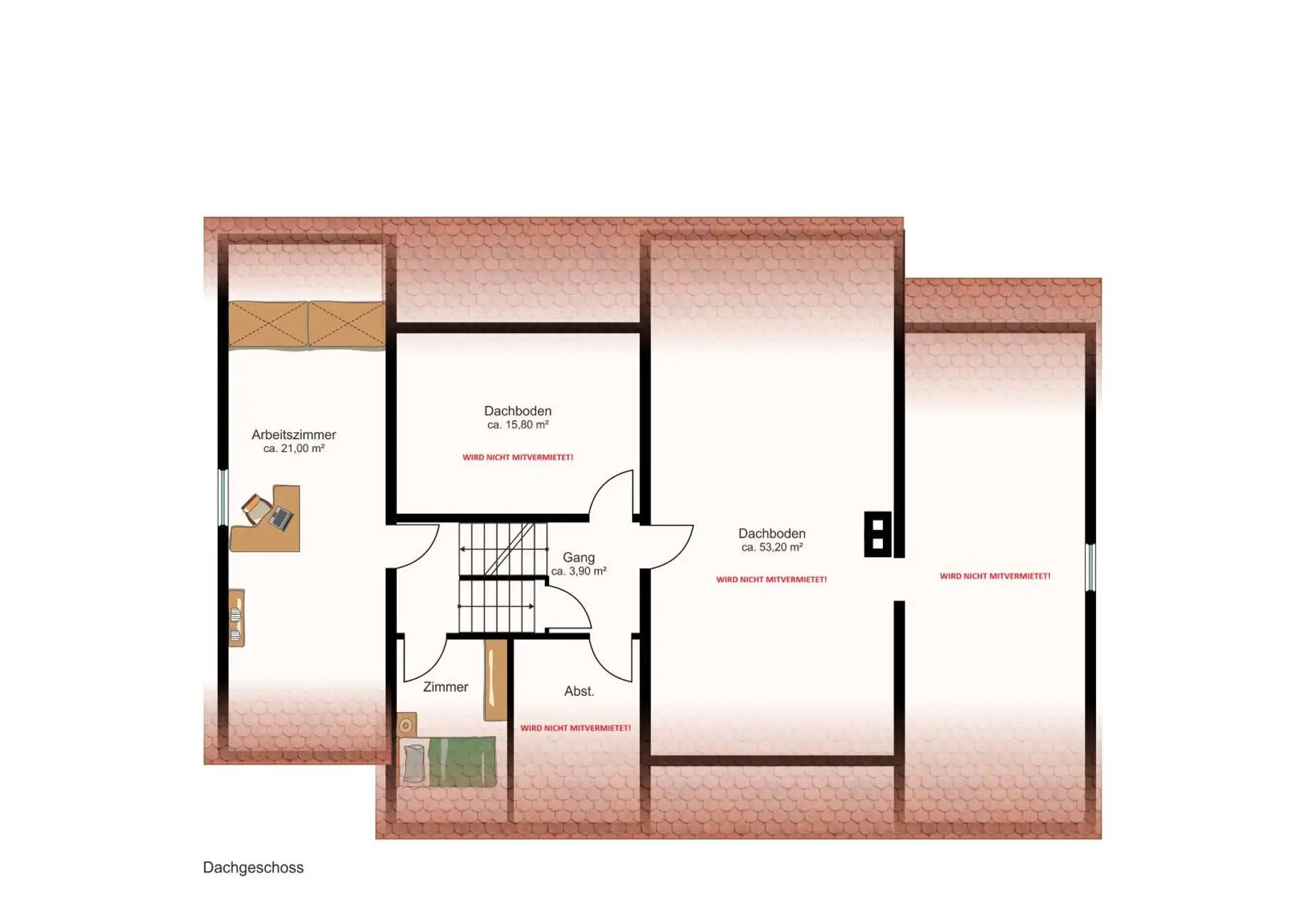 Das Dachgeschoss wird von den Vermietern als Möbellager genutzt und ist nicht Bestandteil des Mietangebots.
