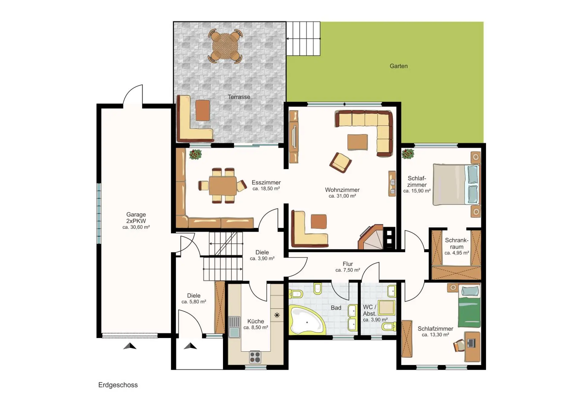 Abgerundet wird dieses attraktive Angebot durch eine Doppelgarage, in der zwei Fahrzeuge hintereinander Platz finden.