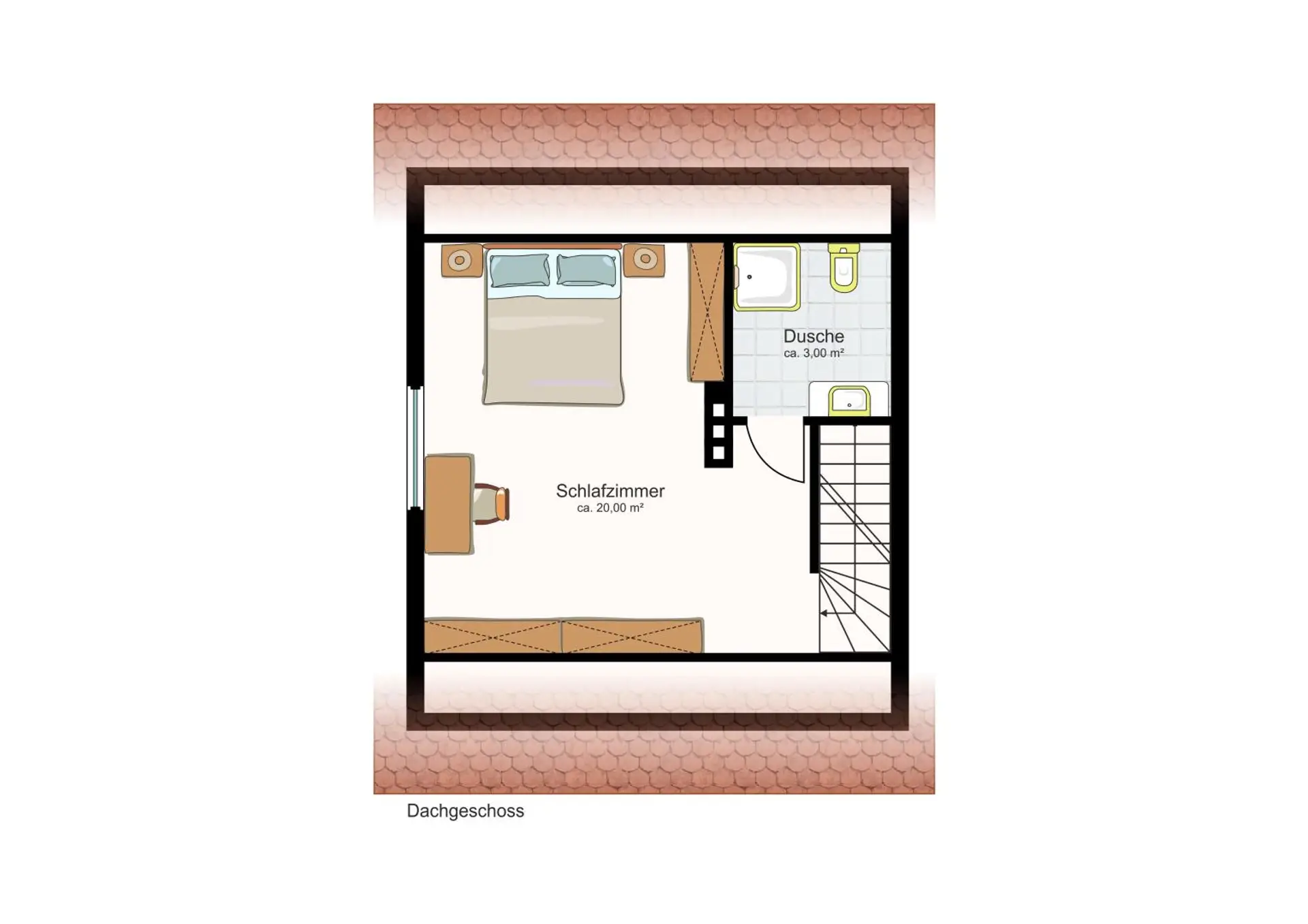 Im Obergeschoss befindet sich ein großzügiges Schlafzimmer mit angenehmer Atmosphäre sowie ein weiteres Badezimmer mit Toilette, wodurch das Haus auch im Alltag komfortabel nutzbar ist.