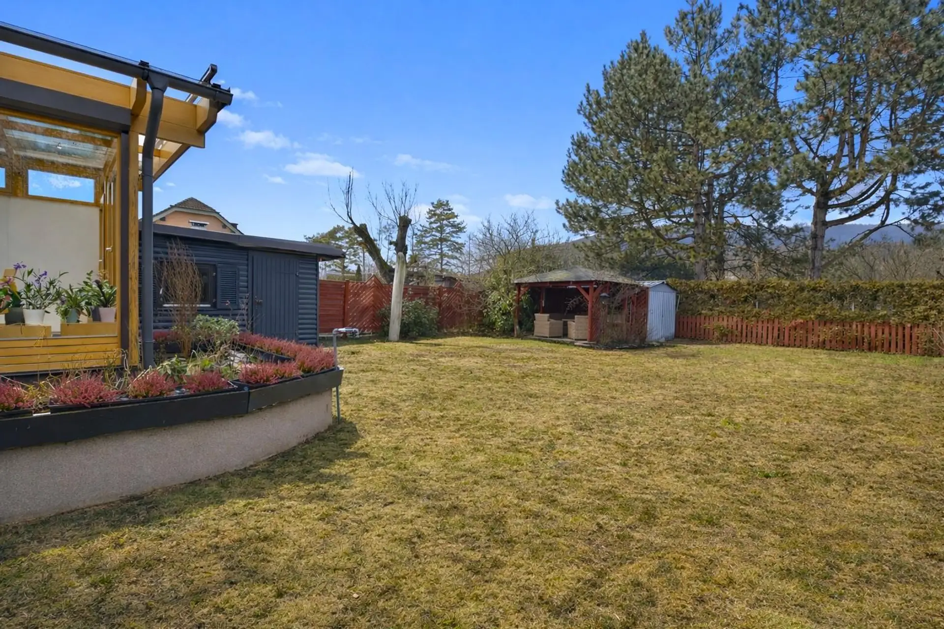Eine Pergola schafft einen geschützten Platz für gemütliche Stunden im Freien, während zwei Gartenhütten zusätzlichen Stauraum oder Platz für Hobby und Werkstatt bieten.