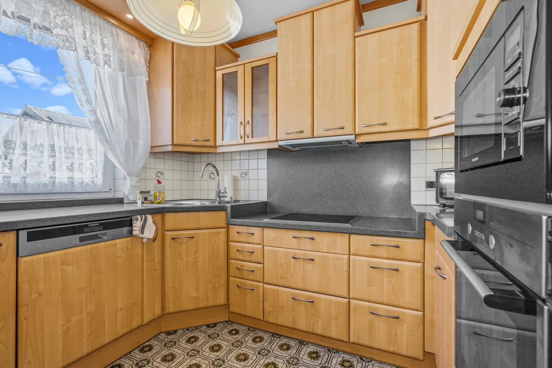 The bungalow is fully basemented, offering plenty of additional space. In addition to a cozy party room, there is a boiler room and a workshop with direct access to the garage. A garage is also available, allowing for convenient and secure parking. The basement can also be accessed directly from the garden.