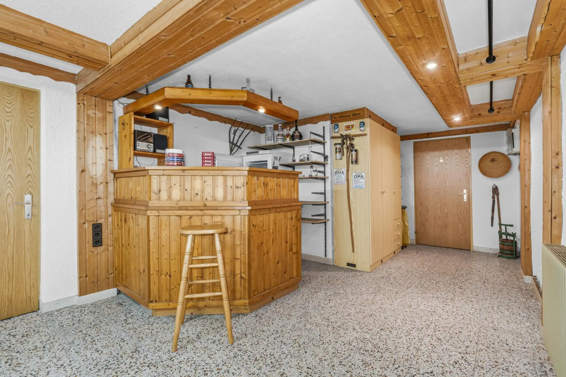 Der Bungalow ist voll unterkellert und bietet dadurch viel zusätzlichen Platz. Neben einem gemütlichen Partykeller stehen ein Heizraum sowie ein Werkraum mit direktem Zugang zur Garage zur Verfügung. Zusätzlich ist eine Garage vorhanden, die bequemes und sicheres Parken ermöglicht. Der Keller ist zudem auch vom Garten aus erreichbar.