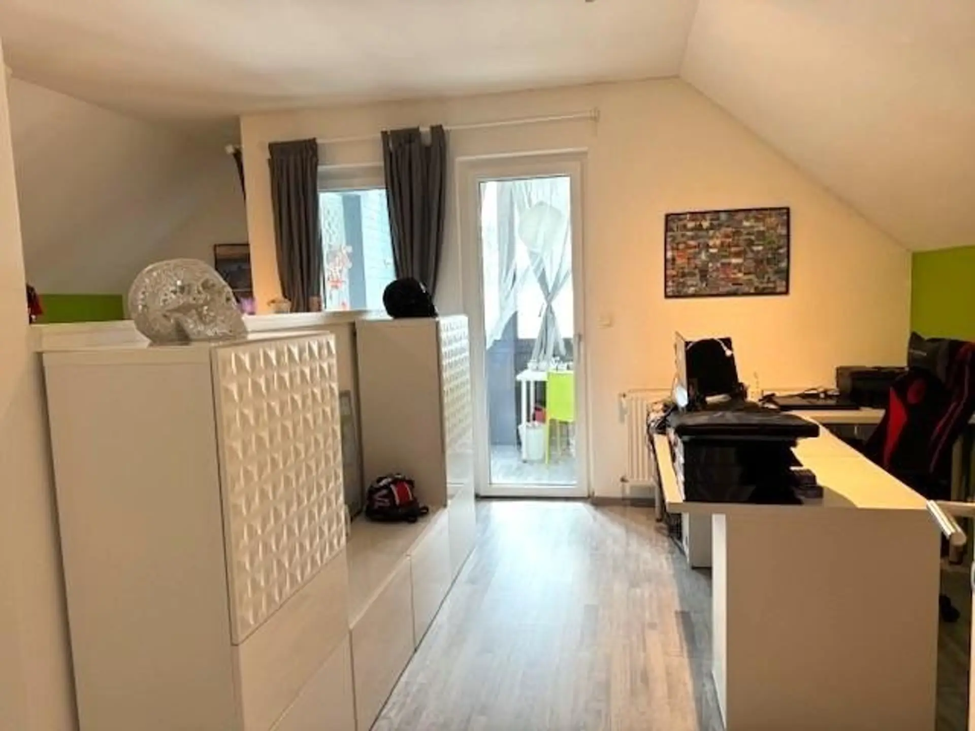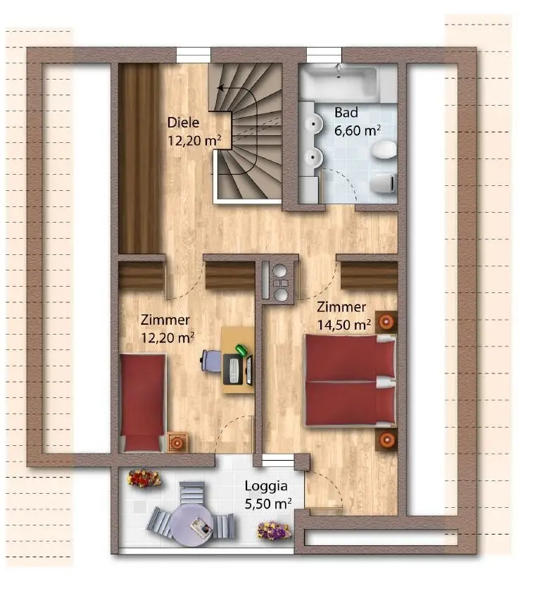 Dachgeschoß: Diele ca. 12m², Badezimmer ca. 6,6m² mit Doppelwaschbecken, Fenster und Badewanne, Zimmer ca. 12m², Zimmer ca. 14,5m² mit Ausgang auf die ca. 5,5m² große südseitige, verglaste Loggia. (momentan ist die Wand zwischen beiden Zimmern entfernt, diese könnte jedoch mit kleinen Handgriffen wieder errichtet werden)