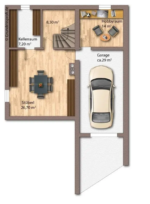 Keller: Vorraum ca. 8m², Waschüche mit WC ca. 7m², Kellerstüberl ca. 26,7m² mit kleinem Abstellraum, Hobby/kelleraum ca. 14m², Garage/Werstatt ca. 29m².