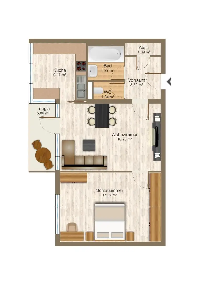 Die Raumaufteilung ist praktisch und bietet ausreichend Platz für Singles oder Paare.