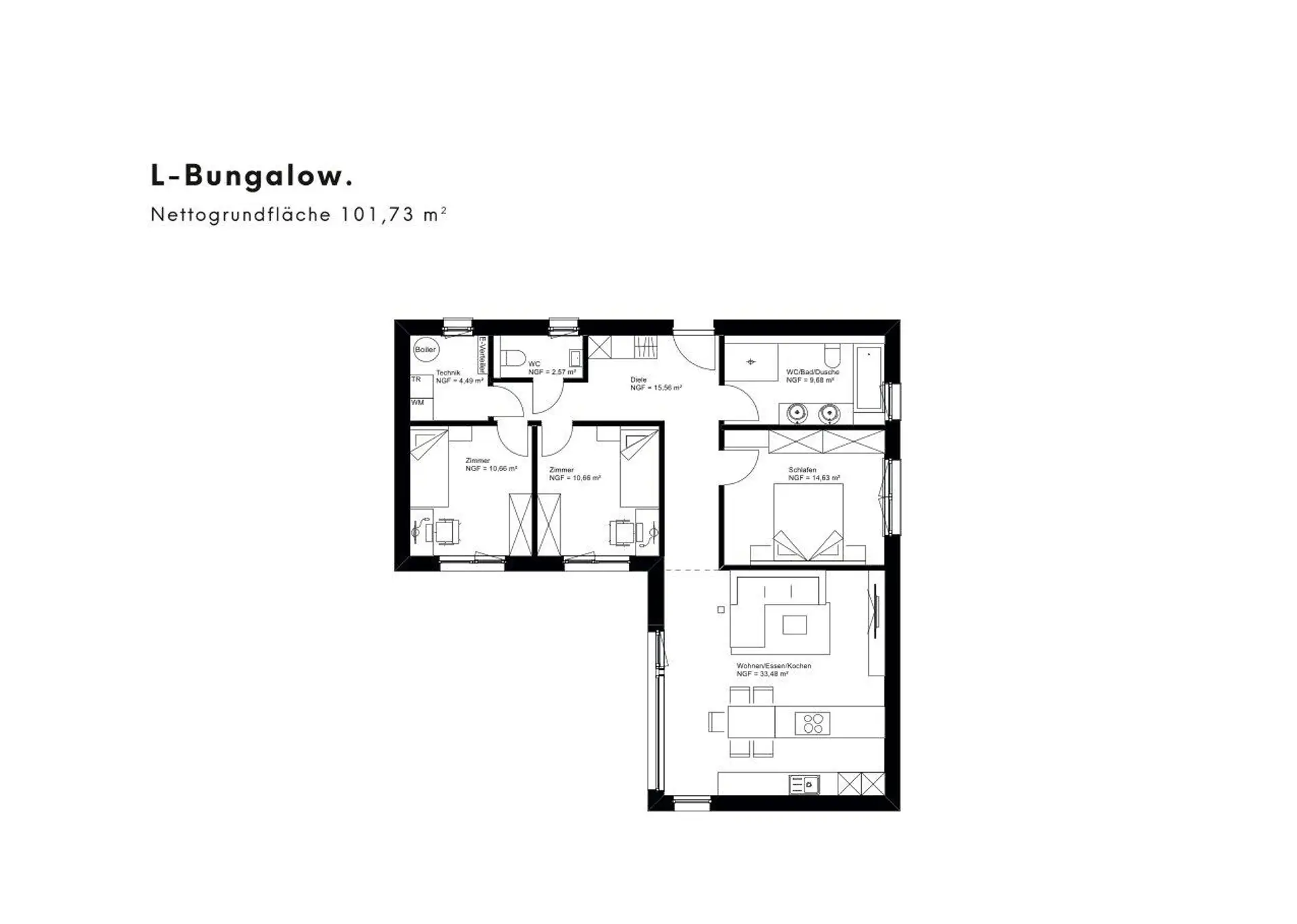 Der Haustyp Bungalow, mit einer Wohnfläche von ca. 101 m2, überzeugt durch klare Linien, offene Raumkonzepte und hochwertige Materialien. Individualplanung möglich!