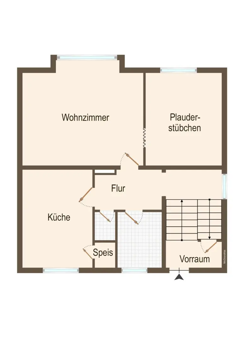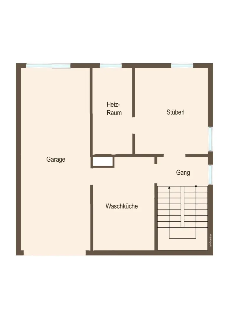 Im Erdgeschoß: Vorraum, ein oder zwei Zimmer, Küche mit Speis, Bad und Toilette. Im Dachgeschoß Vorraum, zwei Zimmer und der Dachboden. Keller mit Stüberl, Heizraum, Waschraum und Garage.