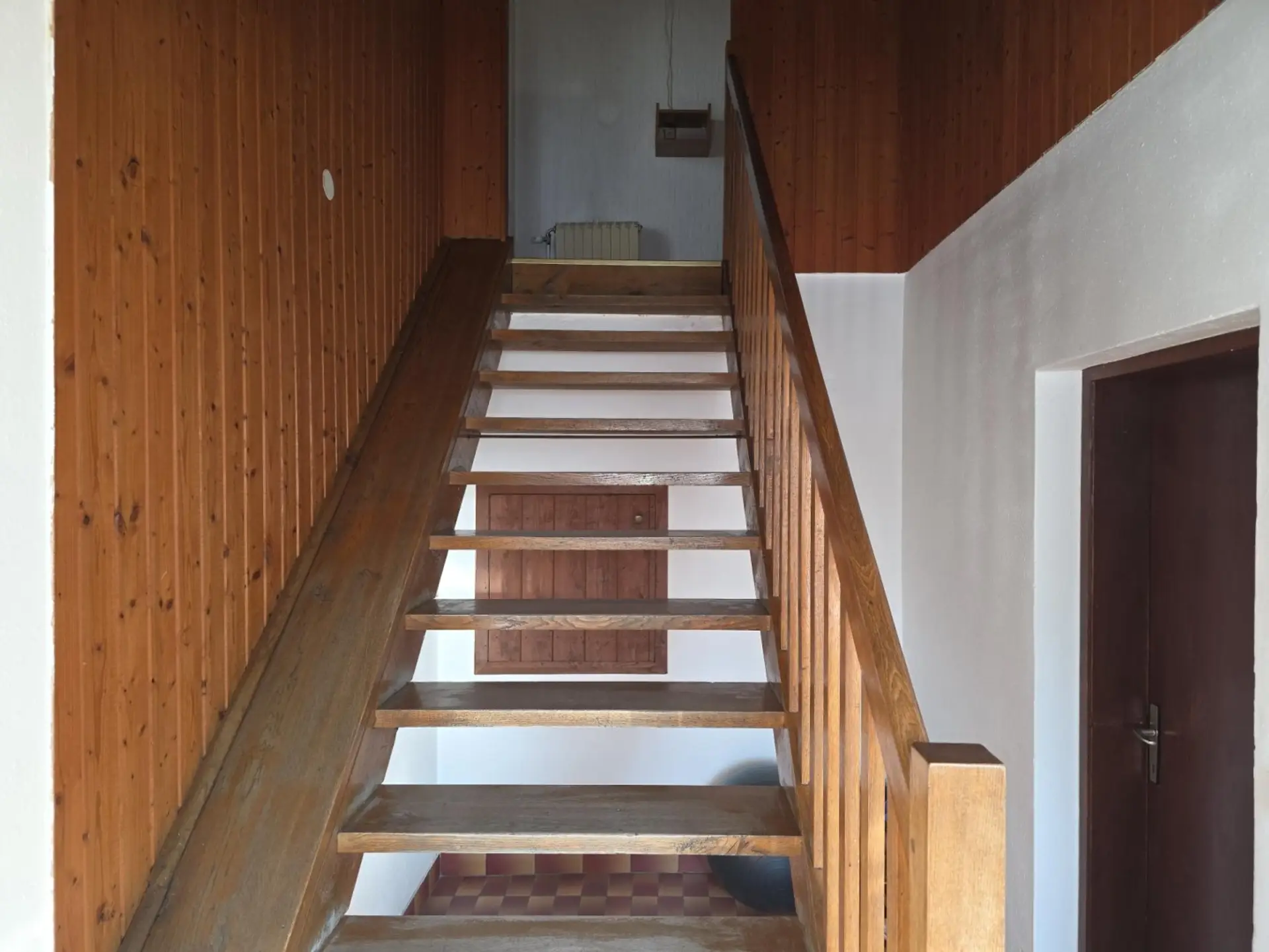 Auf der Wohnebene im ersten Stock gibt es einen Vorraum mit Ausgang auf die Terrasse, die Küche mit angrenzendem Esszimmer, das Wohnzimmer mit Ausgang auf den ca. 20m² großen Balkon mit Blick auf den Vorgarten, drei Schlafzimmer sowie Bad und Toilette.