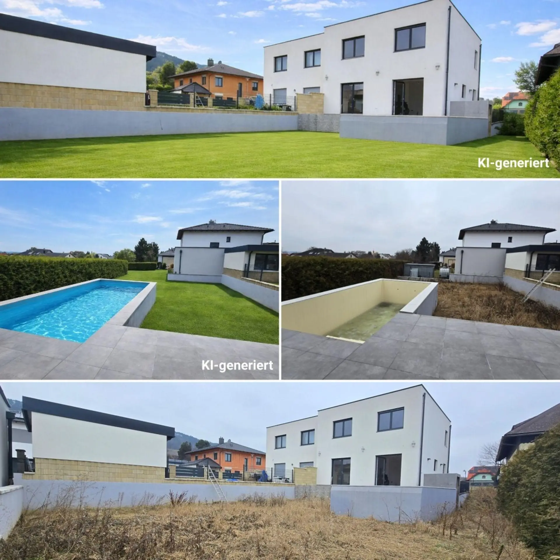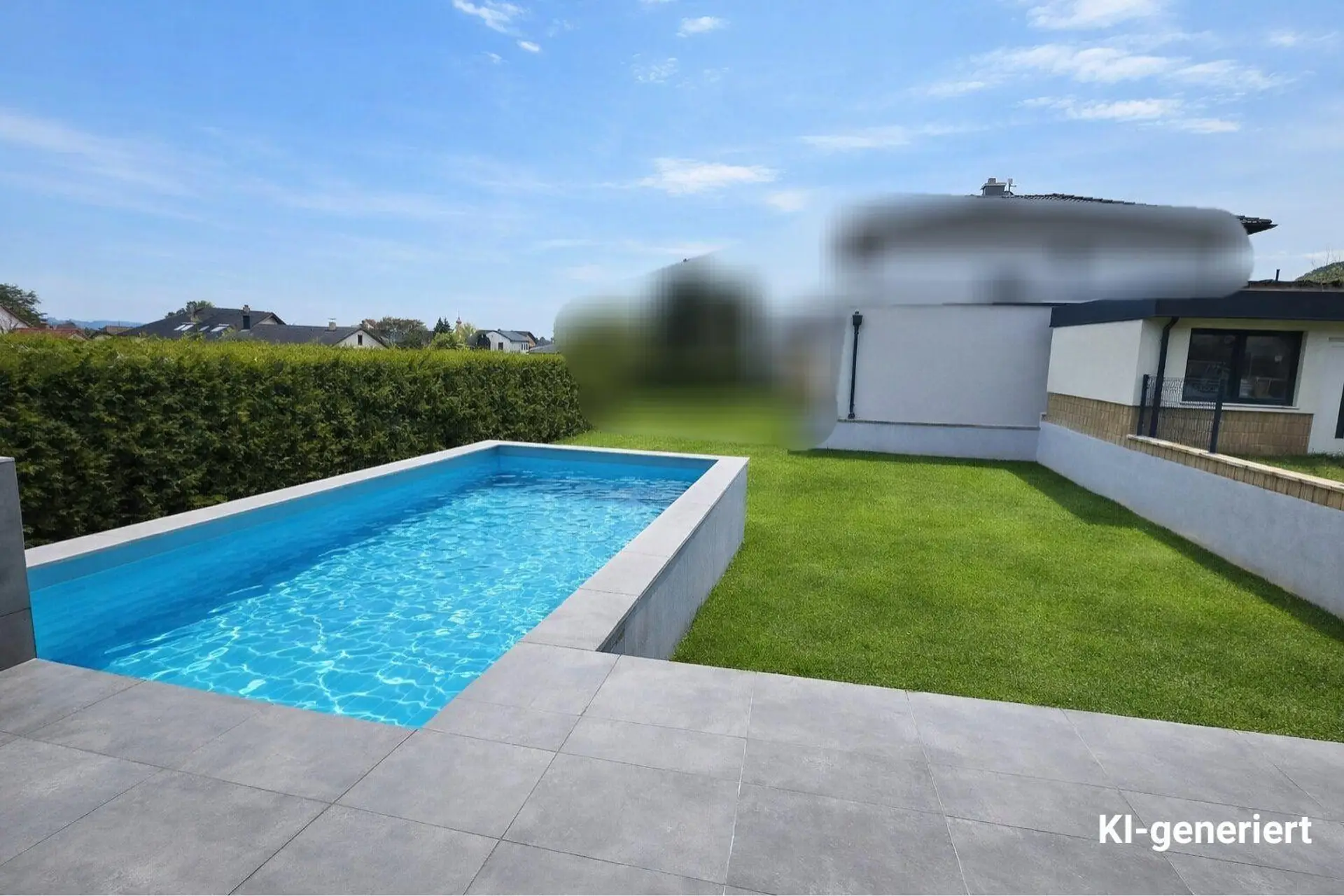 Der Garten bietet die ideale Größe für Familien, ohne hohen Pflegeaufwand. Die direkte Verbindung zwischen Wohnbereich, Terrasse und Pool schafft ein exklusives Urlaubsgefühl im eigenen Zuhause.