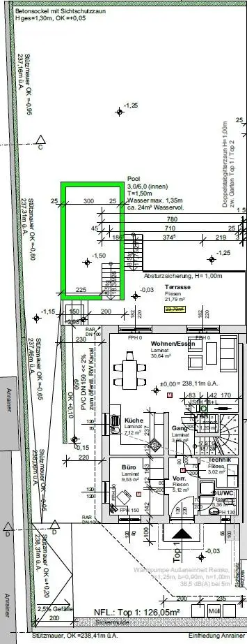 Ein besonderes Highlight ist der direkt angrenzende 3 x 6 m große Pool – von der ca. 22 m² großen Terrasse gelangen Sie mit nur einem Schritt ins kühle Nass.