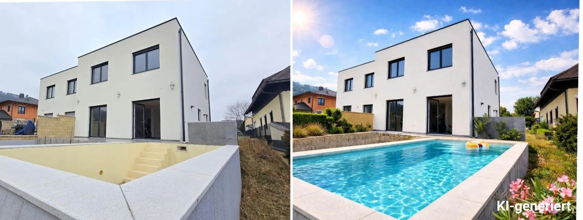 Diese moderne Doppelhaushälfte in Reichersdorf vereint energieeffiziente Bauweise, zeitgemäße Architektur und gehobenen Wohnkomfort. Der großzügige Grundriss, die lichtdurchfluteten Räume sowie der Pool mit direktem Terrassenzugang machen diese Immobilie zu einem besonderen Zuhause für anspruchsvolle Käufer.