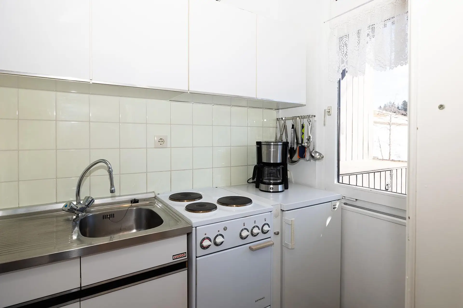 Schon beim Eintreten spürt man: Hier zählt Gemütlichkeit. Der helle Wohn- und Essbereich mit liebevoller Einrichtung lädt zum Ankommen ein, die Schlafnische sorgt für erholsame Nächte nach aktiven Tagen in der Natur. Die praktische Küche ist kompakt, aber bestens geeignet für das Frühstück vor der Wanderung oder ein entspanntes Abendessen.