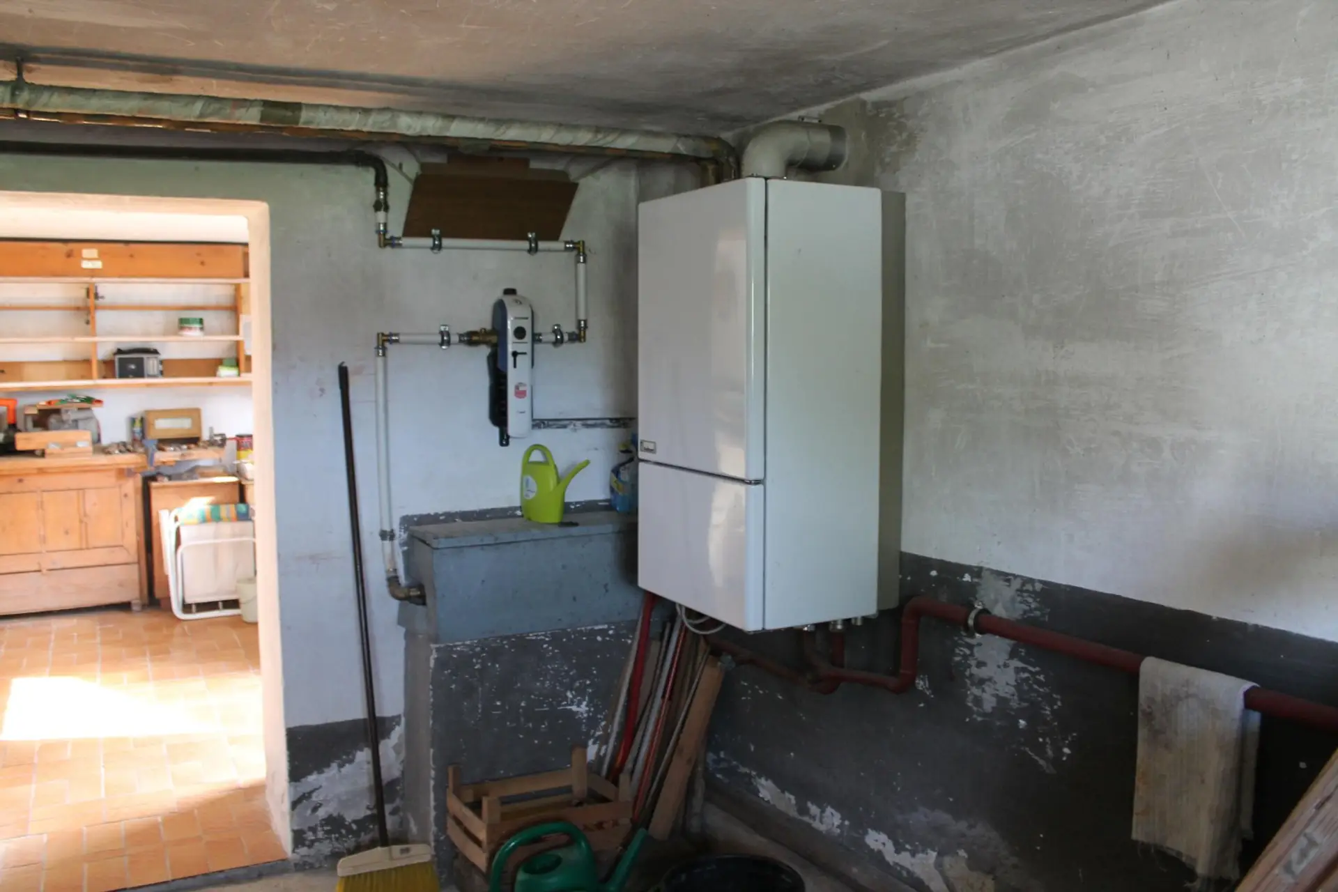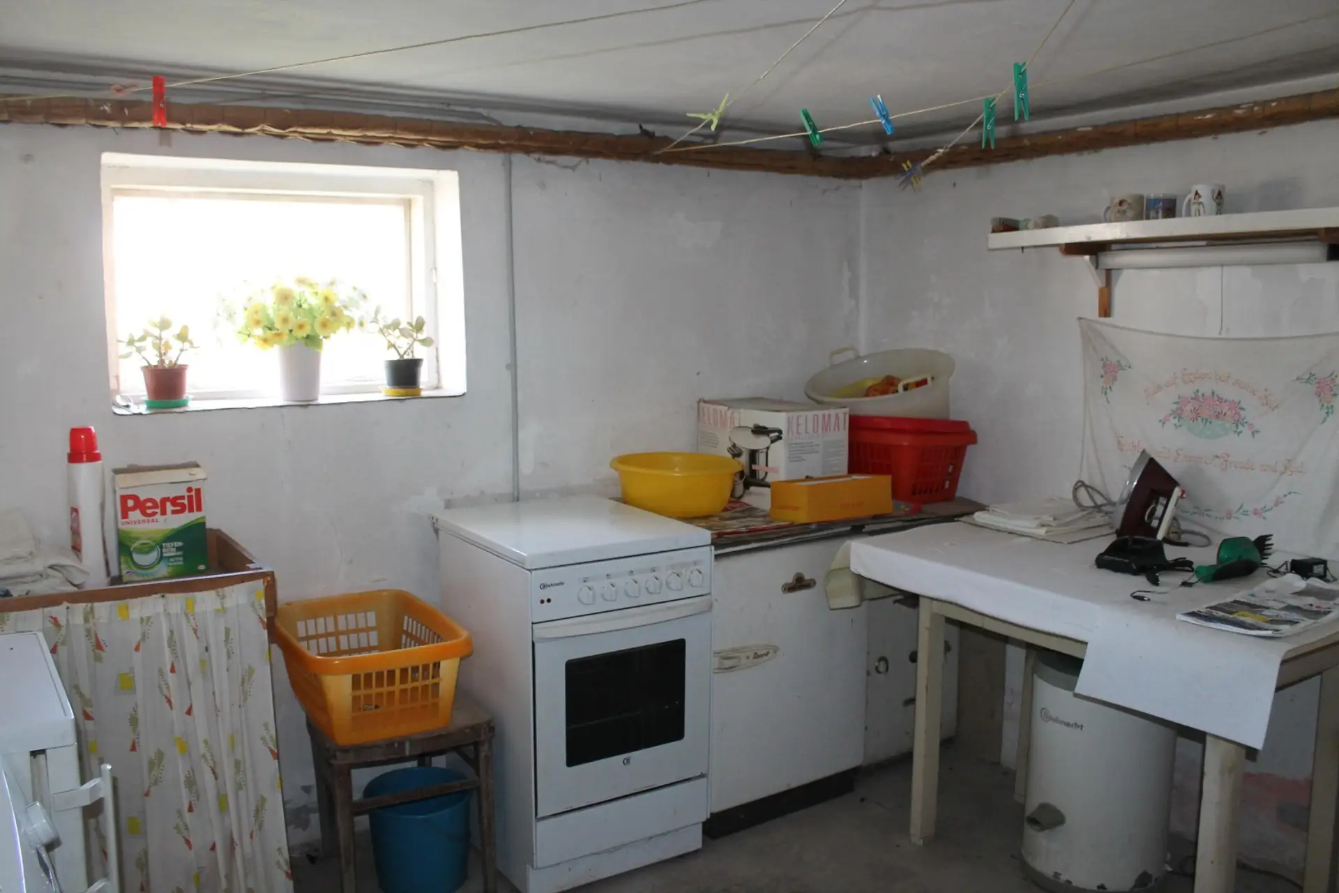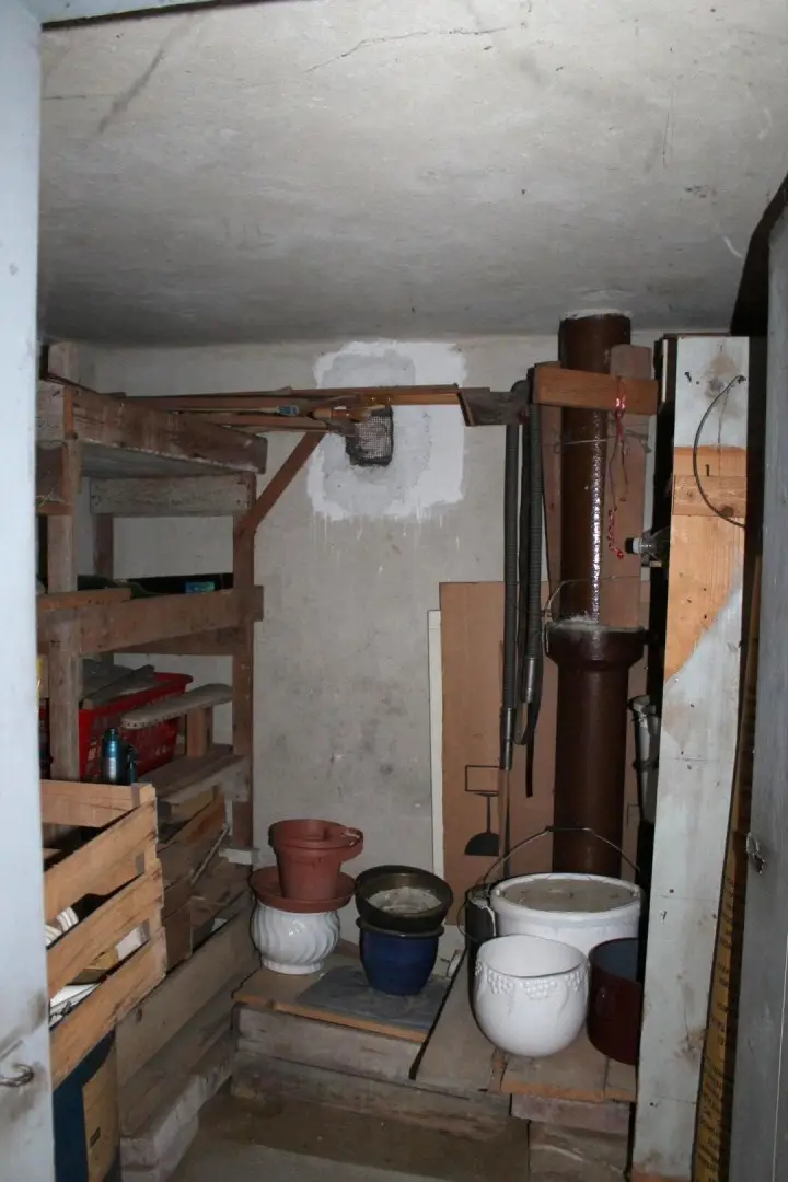 Das Haus ist voll unterkellert, im Keller befindet sich der Heizraum (Gastherme und Kessel für feste Brennstoffe), eine kleine Werkstatt, die Waschküche, ein Lagerraum und die Garage.