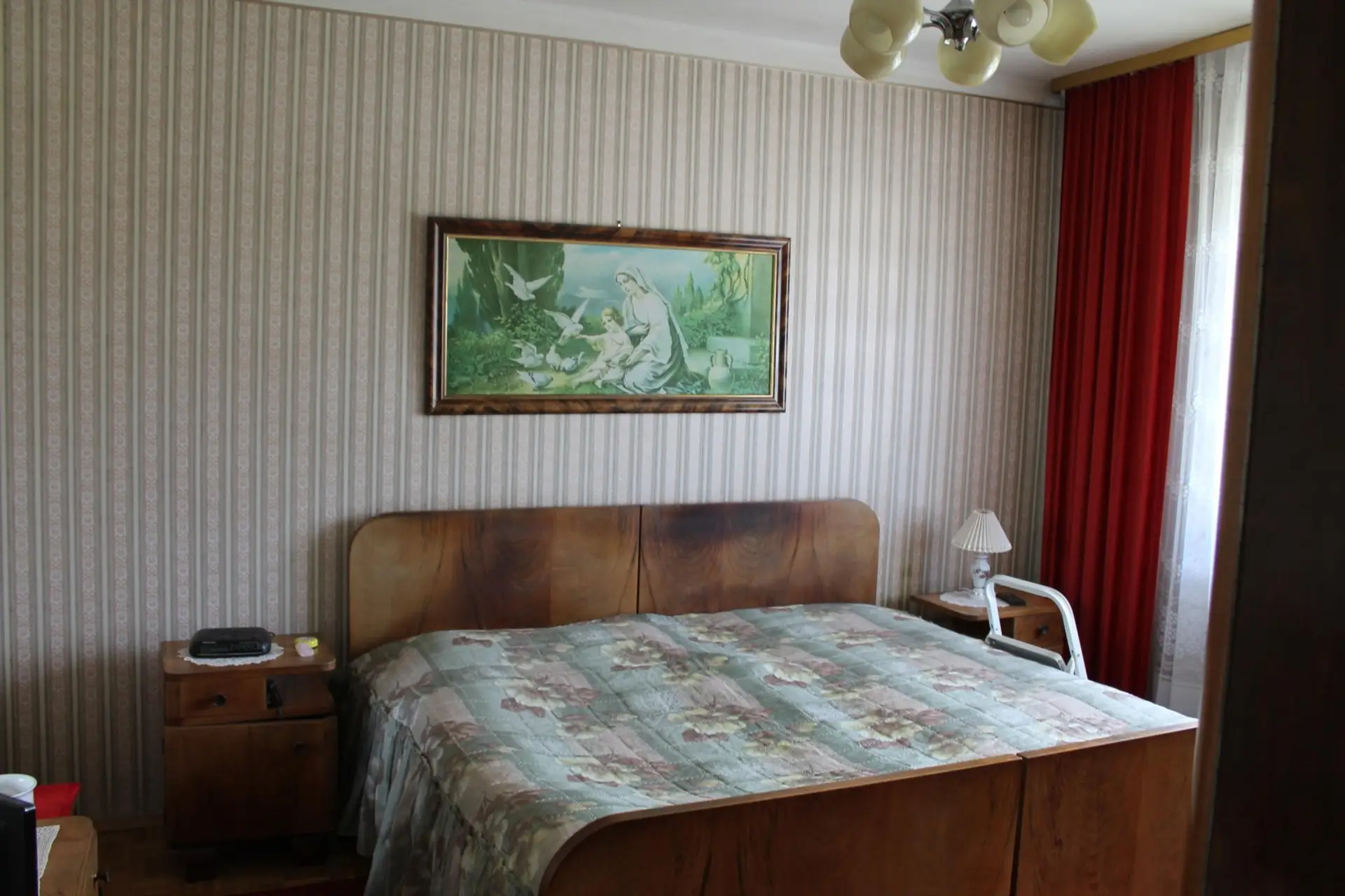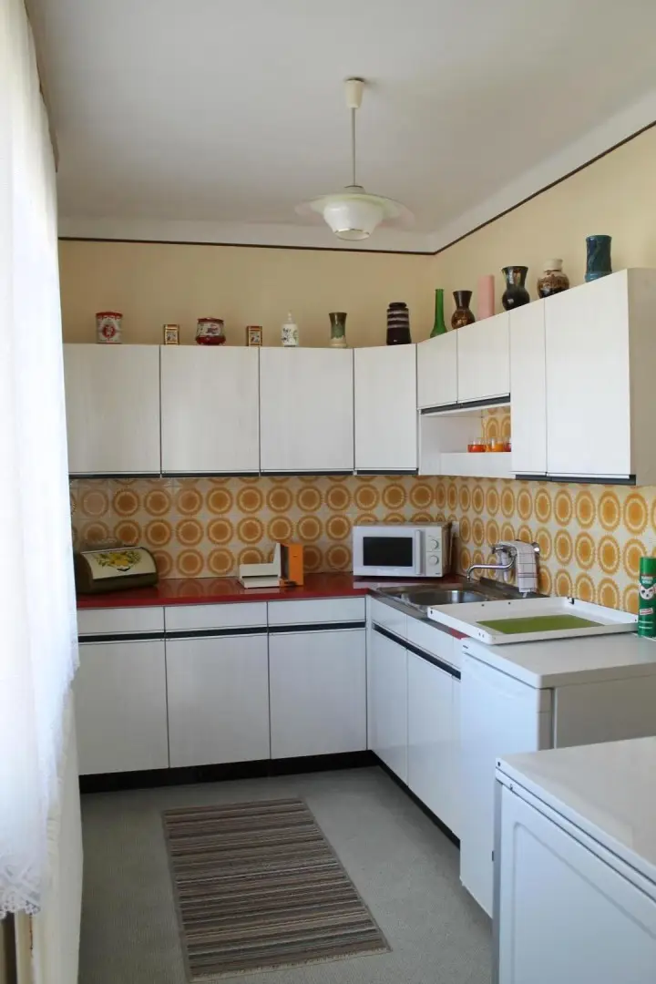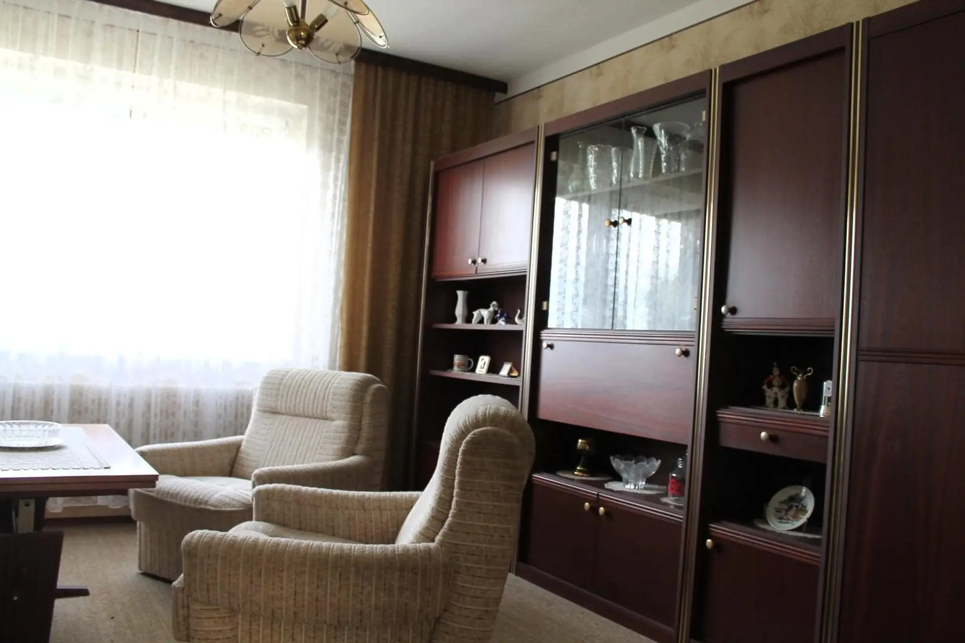 Im Schlaf- und Kinderzimmer befindet sich ein Holzparkettboden, in den anderen Räumen liegen Teppichböden bzw. PVC-Böden.